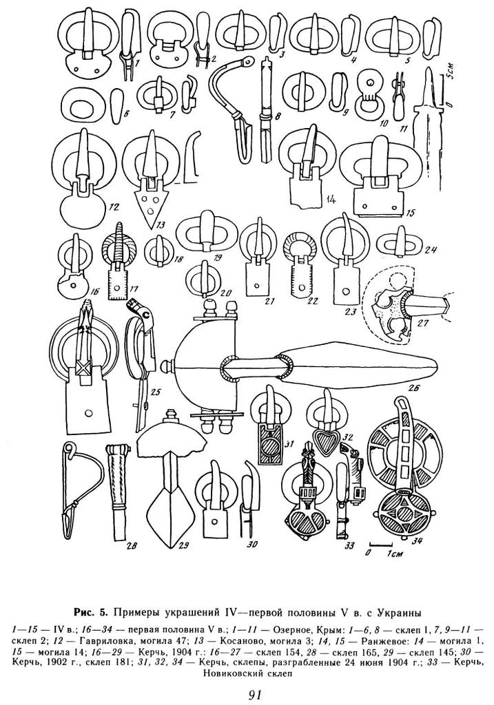 Рис. 5. Примеры украшений IV — первой половины V в. с Украины. 1-15 — IV в.; 16-34 — первая половина V в.; 1-11 — Озёрное, Крым: 1-6, 8 — склеп 1, 7, 9-11 — склеп 2; 12 — Гавриловка, могила 47; 13 — Косаново, могила 3; 14, 15 — Ранжевое: 14 — могила 1, 15 — могила 14; 16-29 — Керчь, 1904 г.: 16-27 — склеп 154, 28 — склеп 165, 29 — склеп 145; 30 — Керчь, 1902 г., склеп 181; 31, 32, 34 — Керчь, склепы, разграбленные 24 июня 1904 г.; 33 — Керчь, Новиковский склеп.