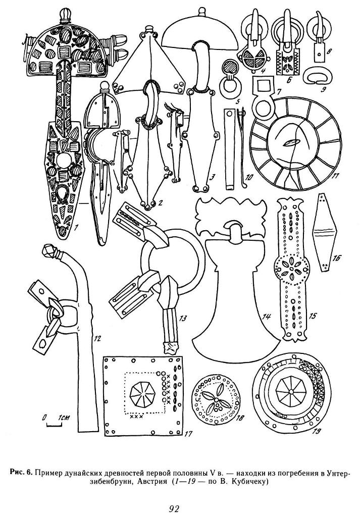 Рис. 6. Пример дунайских древностей первой половины V в. — находки из погребения в Унтерзибенбрунн, Австрия (1-19 — по В. Кубичеку).