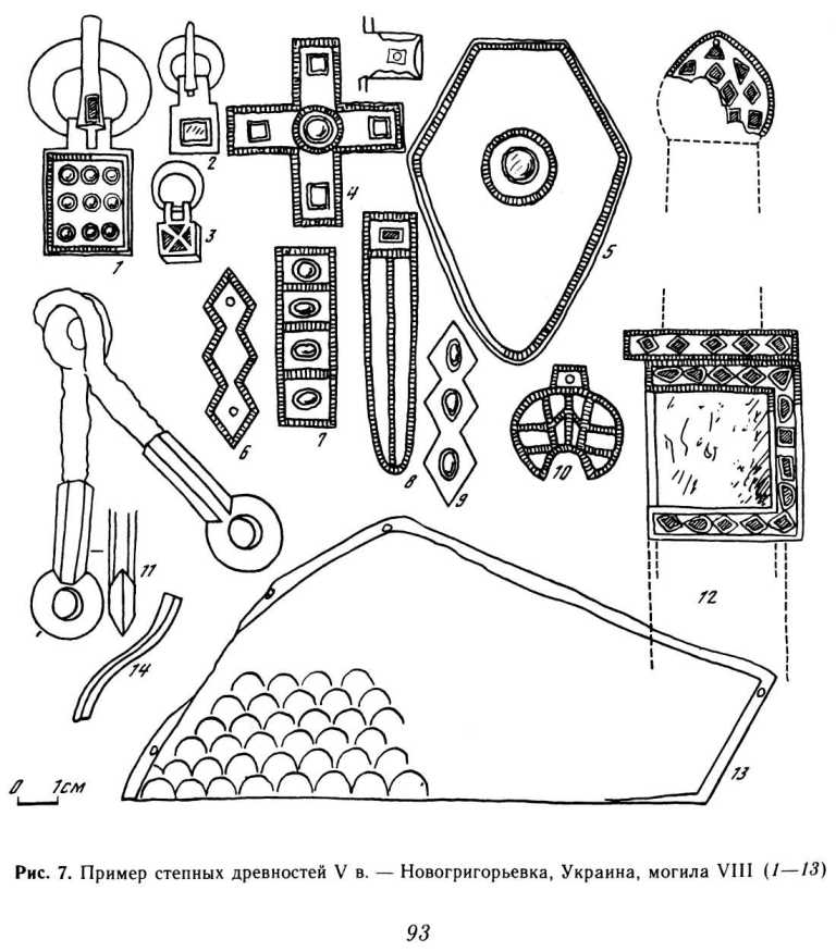 Рис. 7. Пример степных древностей V в. — Новогригорьевка, Украина, могила VIII (1-13).