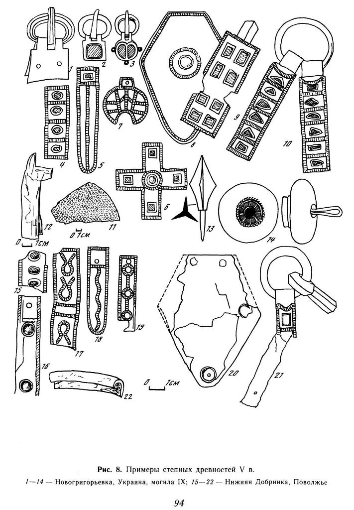 Рис. 8. Примеры степных древностей V в. 1-14 — Новогригорьевка, Украина, могила IX; 15-22 — Нижняя Добринка, Поволжье.