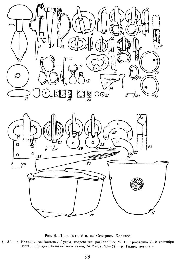 Рис. 9. Древности V в. на Северном Кавказе. 1-21 — г. Нальчик, за Вольным Аулом, погребение, раскопанное М.И. Ермоленко 7-8 сентября 1923 г. (фонды Нальчикского музея, № 2525); 22-31 — р. Гиляч, могила 4.