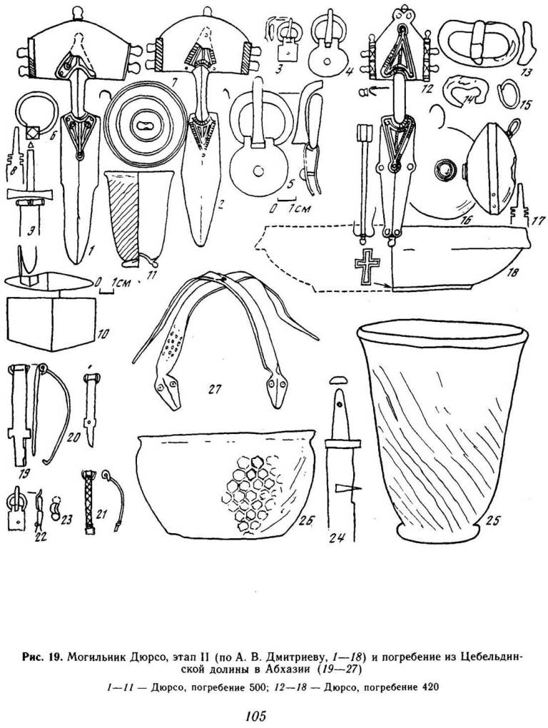 Рис. 19. Могильник Дюрсо, этап II (по А.В. Дмитриеву, 1-18) и погребение из Цебельдинской долины в Абхазии (19-27). 1-11 — Дюрсо, погребение 500; 12-18 — Дюрсо, погребение 420.