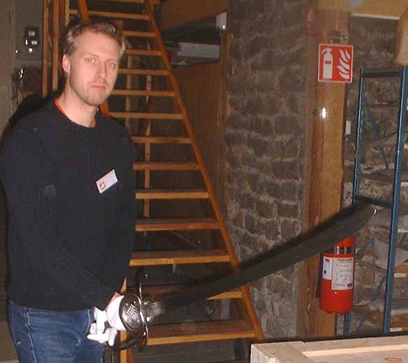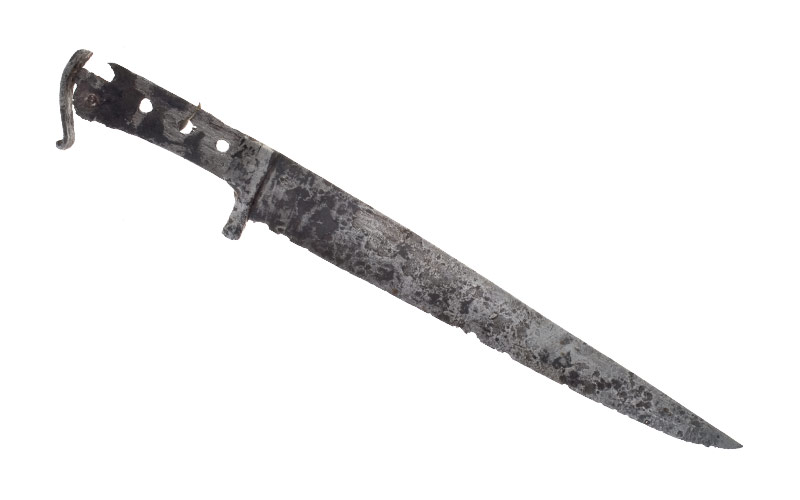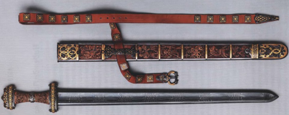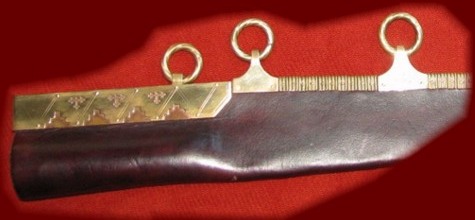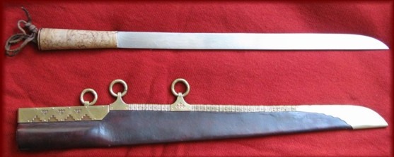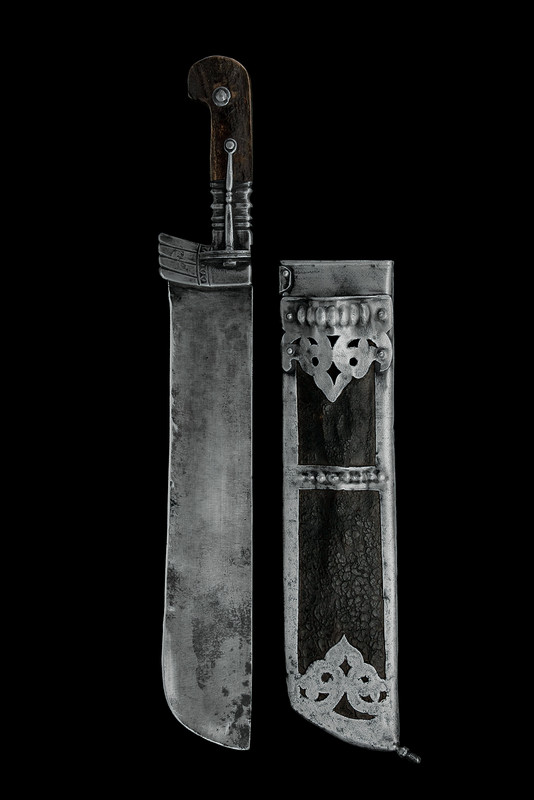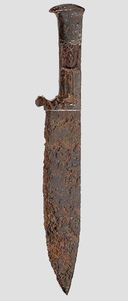 Крестьянский боевой нож. Общая длина: 37,3 см, вес: 260 г. Длина клинка 26,3 см, ширина у пятки - 3,6 см. Был замечен на аукционе Galerie Fischer, Люцерн, 25.11.1959, № 161. Боевой нож Викингов, так назваемый Скрамасакс. Это реплика одной из находок в Бирке на о. Готланд. Накладки на ножнах и кольца позволяют сделать предположение о том что это военное оружие. Большой нож из Южной Германии, по Амвросий Klingenätzung Gemlich, Мюнхен, 1532. German Historic Museum (DHM). Берлин.