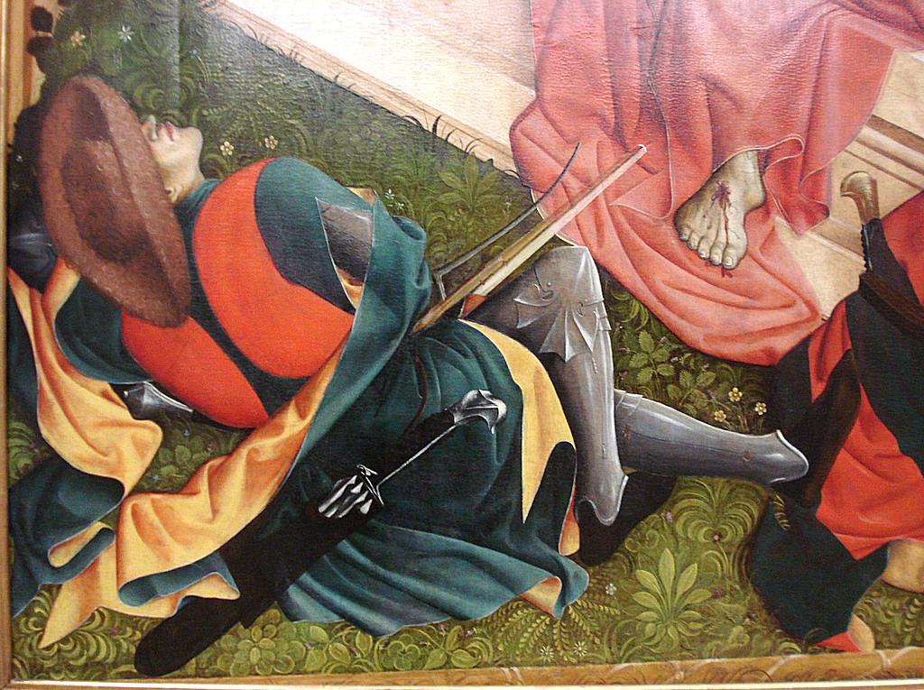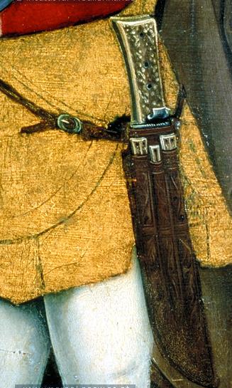 Такие себе "средневековые тактические боевые ножи" у араблетчика в ножнах для его тесака предусмотрены карманы для запасных болтов. 1437 год - Wurzach altar (Hans Multsher), Gemaldegalerie, Берлин, Германия.  картина полностью