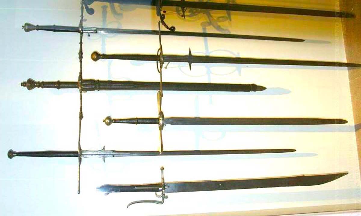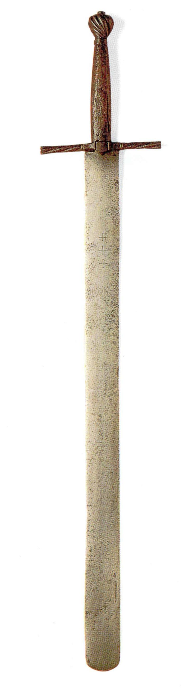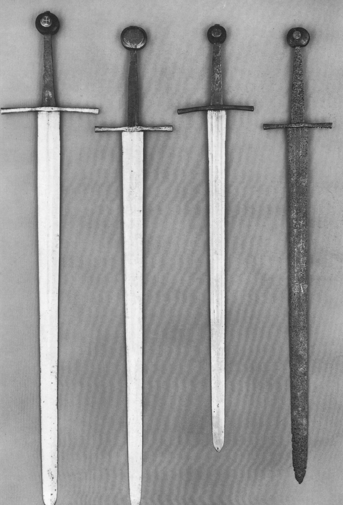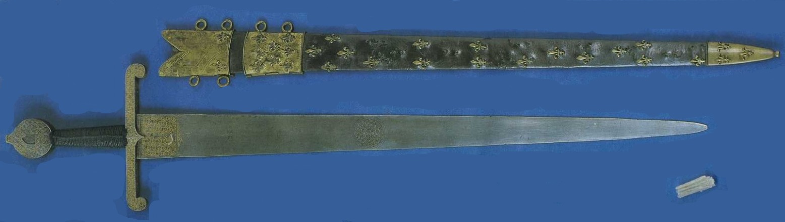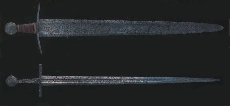 Правый меч кажется коротким из-за диспропорции, но на самом деле их длина 80 см. Датированы ок. 1250 г. Musee de L'Armee. Париж инв. j.5 и j.P.2239 Широкий меч итальянского производства 16 век. Крестовина представляет дугу, сваренную из двух половин. Линзовидный в сечении обоюдоострый клинок с двумя короткими долами у пятки, на клинок нанесены причудливые узоры.  Рукоять костяная, склеена после растрескивания.