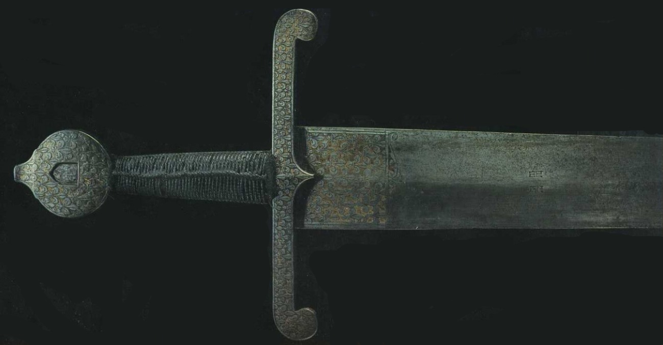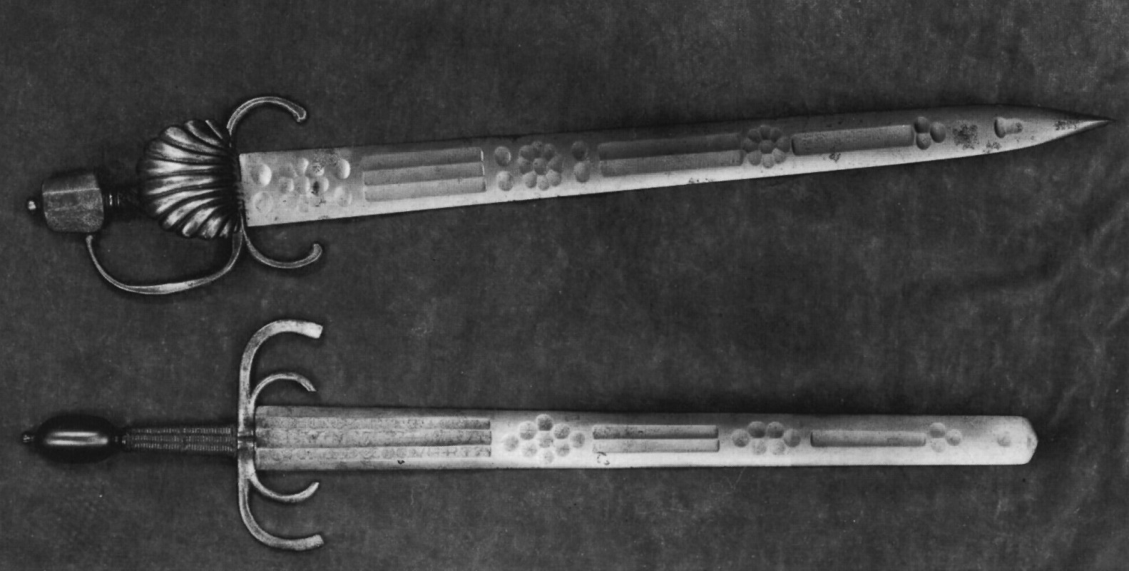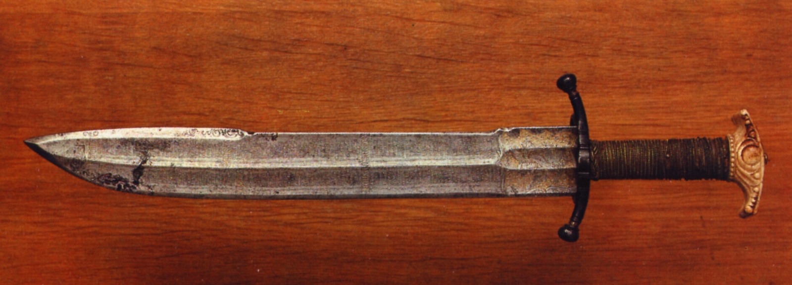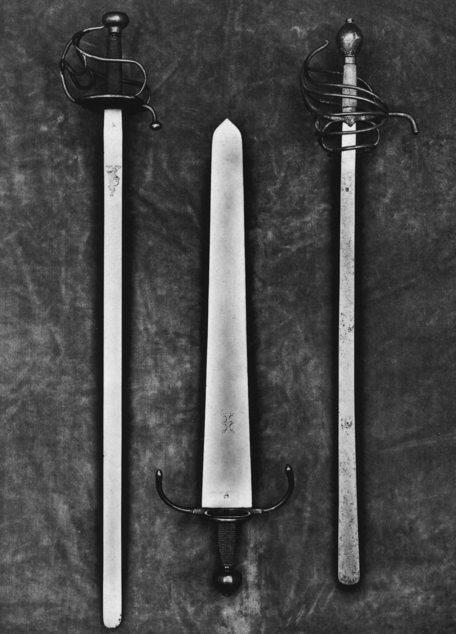 Правый меч кажется коротким из-за диспропорции, но на самом деле их длина 80 см. Датированы ок. 1250 г. Musee de L'Armee. Париж инв. j.5 и j.P.2239 Широкий меч итальянского производства 16 век. Крестовина представляет дугу, сваренную из двух половин. Линзовидный в сечении обоюдоострый клинок с двумя короткими долами у пятки, на клинок нанесены причудливые узоры.  Рукоять костяная, склеена после растрескивания.