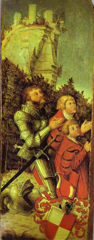 "Рыцарь с двумя сыновьями" 1518-1520. худ. Лукас Кранах I. Показан доспех рыцаря, шлем-арме, декоративный щит, и меч пригодный для использования двумя руками, виднеется навершие кинжала.