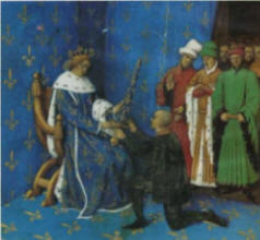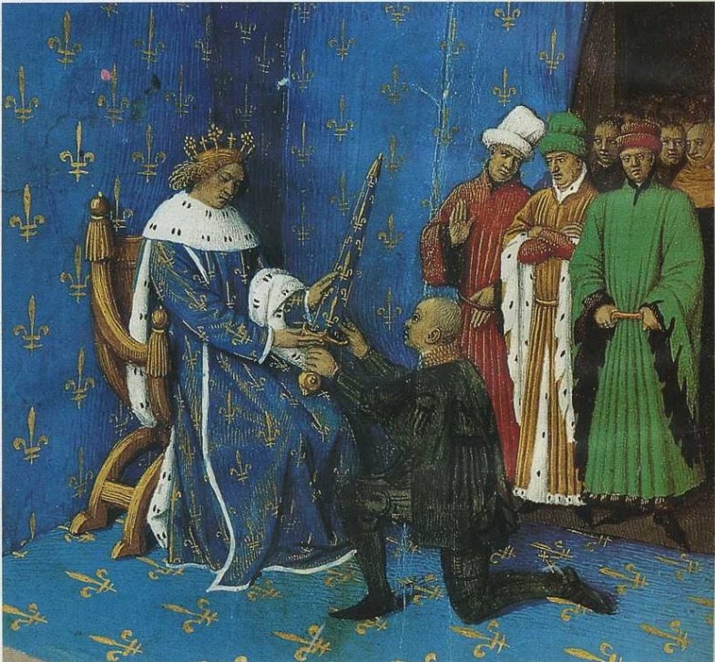Меч коннентабля Франции, вторая пловина 15 века. Musee de L`Armee. Париж. Инв. j.26 Карл 5 передает Бертрану Дю Геклену меч коннентабля Франции. J. Fuquet. Миниатюра из  Великой хроники  Франции 1470 г