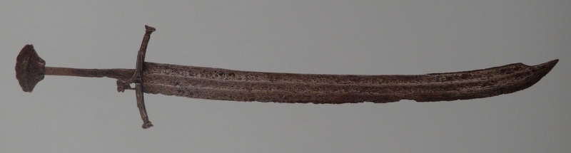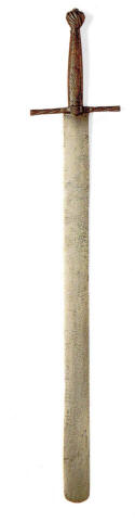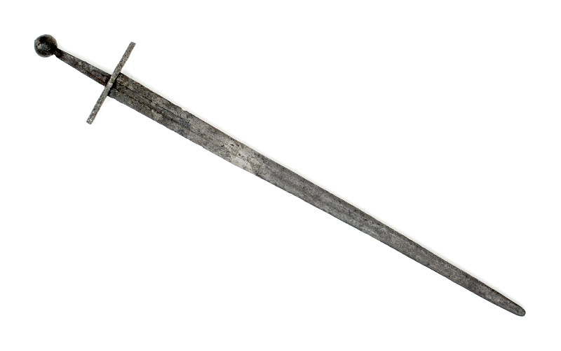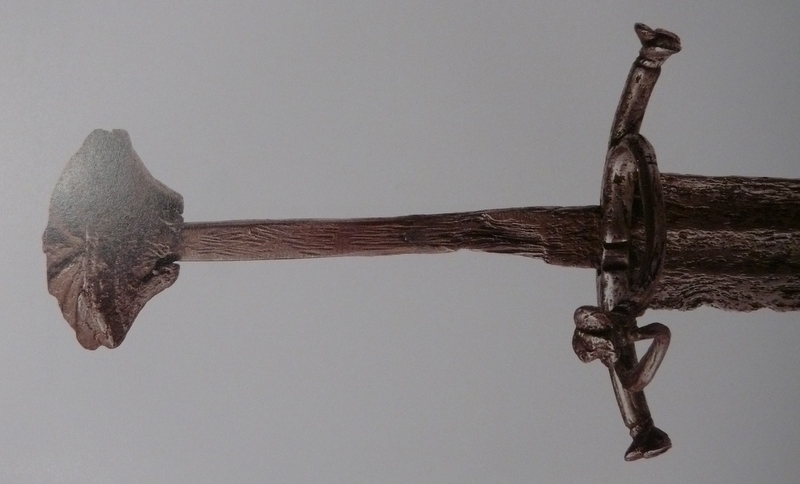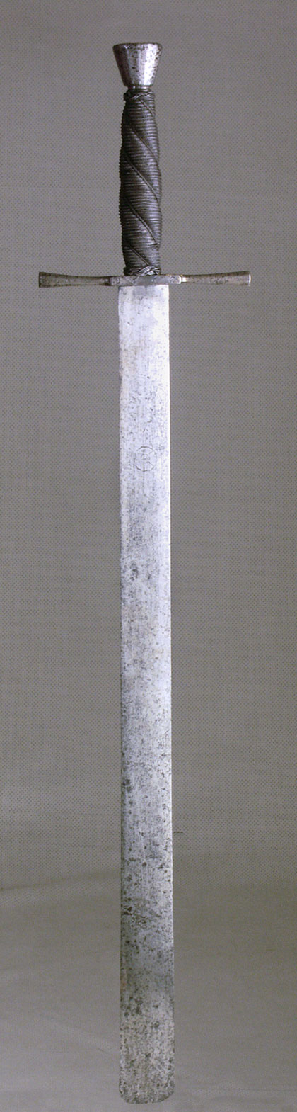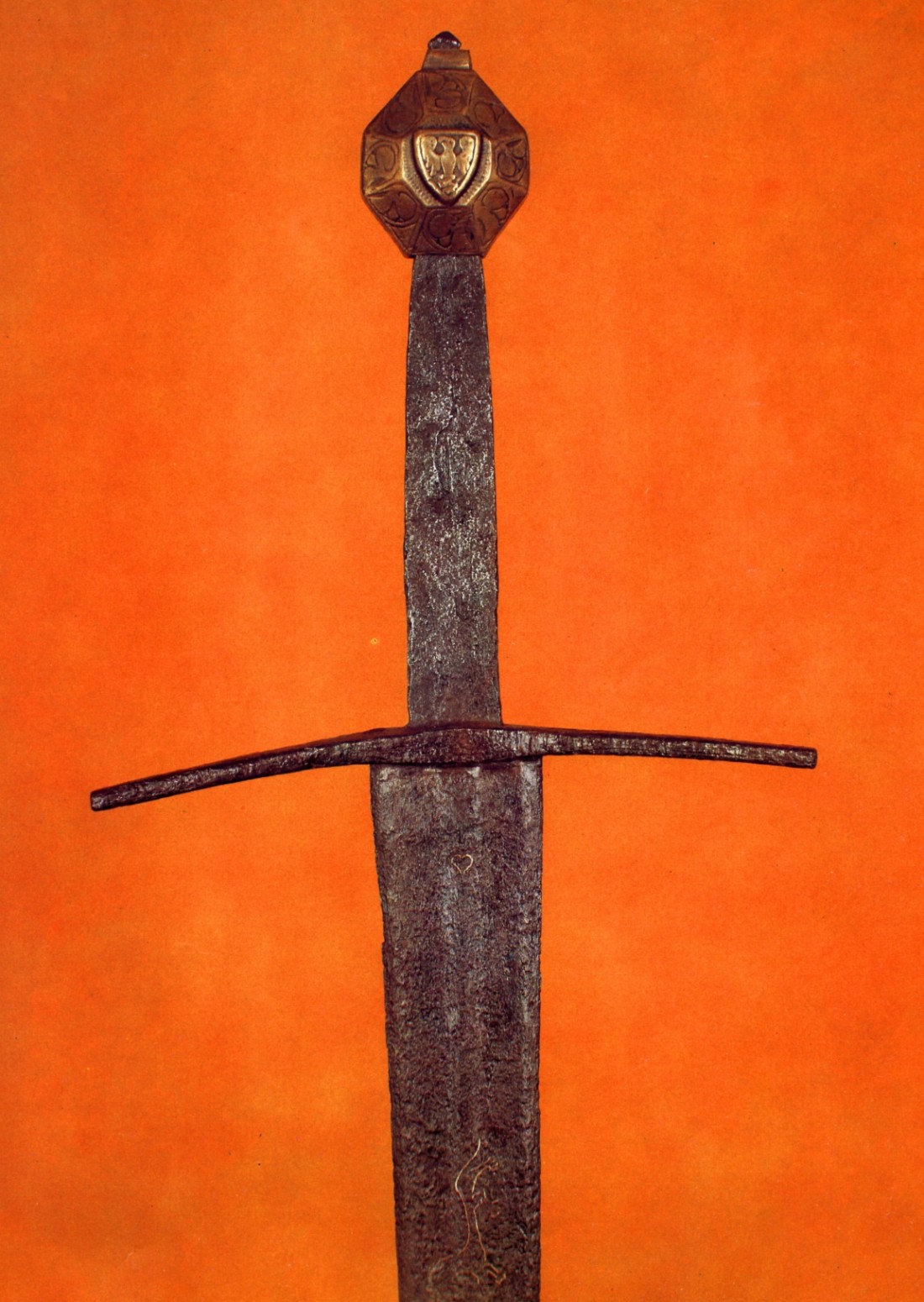 Меч немецкий, примерно 1250 г., рыцарское  оружие. Крестовина квадратного сечения (длина 19 см). Клинок обоюдоострый, постепенно сужается к острию, длина 97 см, ширина у пятки 5,6 см, дол практически на всю длину.  Длина хвостовика (деревянное покрытие отсутствует) 12,8 см.
