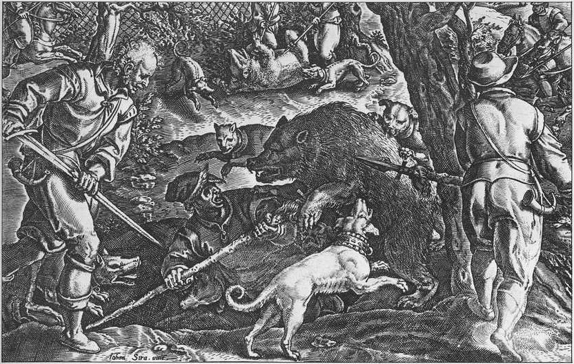 Stradan, "Venationes", Охота на диких кабановОсновное оружие охоты – копьё. Охотник с лева колет кабана мечом взявшись за клинок через тряпочку. Декабрьская охота Максисмилиана. Худ Ван Орли, 1521-1532 г. Лувр. Кроме охотничьего меча вызывает интерес гамбезон у собаки. Охота без  копий не обходится. С лева на право охотничьи мечи: 1580, 1500, 1580 годы. Центральный хоть и охотничий, но выглядит вполне традиционно. Musee de L`Armee. Париж