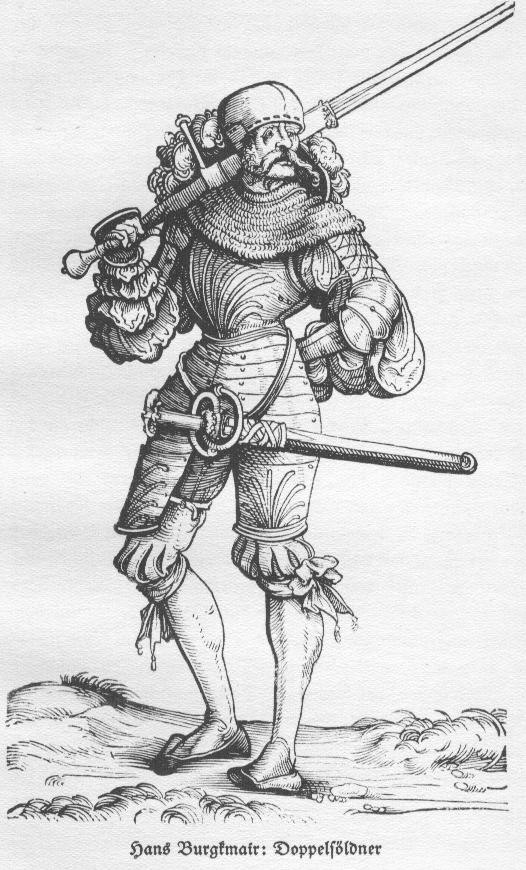 Три меча ландскнехтов, но средний не может считаться катсбалгером. German Historic Museum (DHM) Berlin Катсбалгер с дополнительными дужками закрывающими руку, не совсем типичный, но все-же хороший экземпляр середина 16 века. Дрезденский исторический музей. Гравюра Ганса Буккхеймера (Hans Burgkmair), изображающая доппельсодера, то ест солдата получающего двойное жалование, среди ландскнехтов Максимилиана I. Doppelsöldner Maximilians ~1516г.