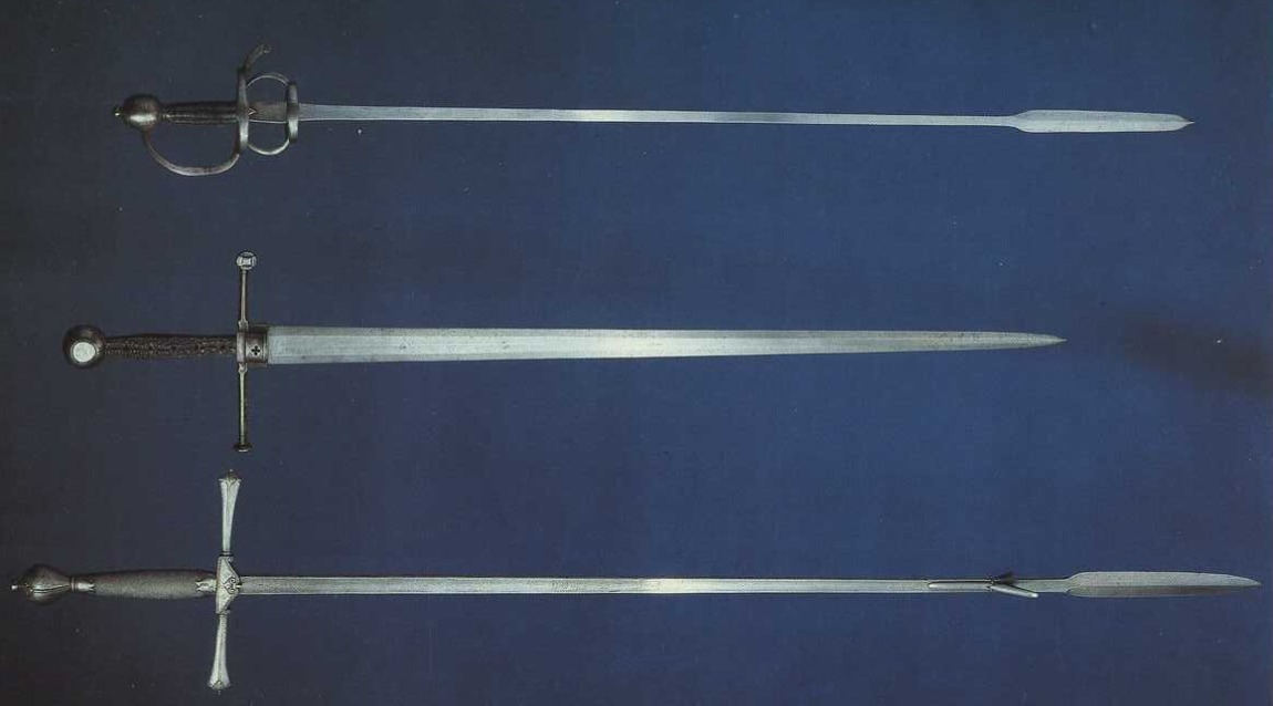 Тренировочные шпаги, а между ними Курцшверт. Шпаги середины 17 века, а курцшверт конца 17 века.