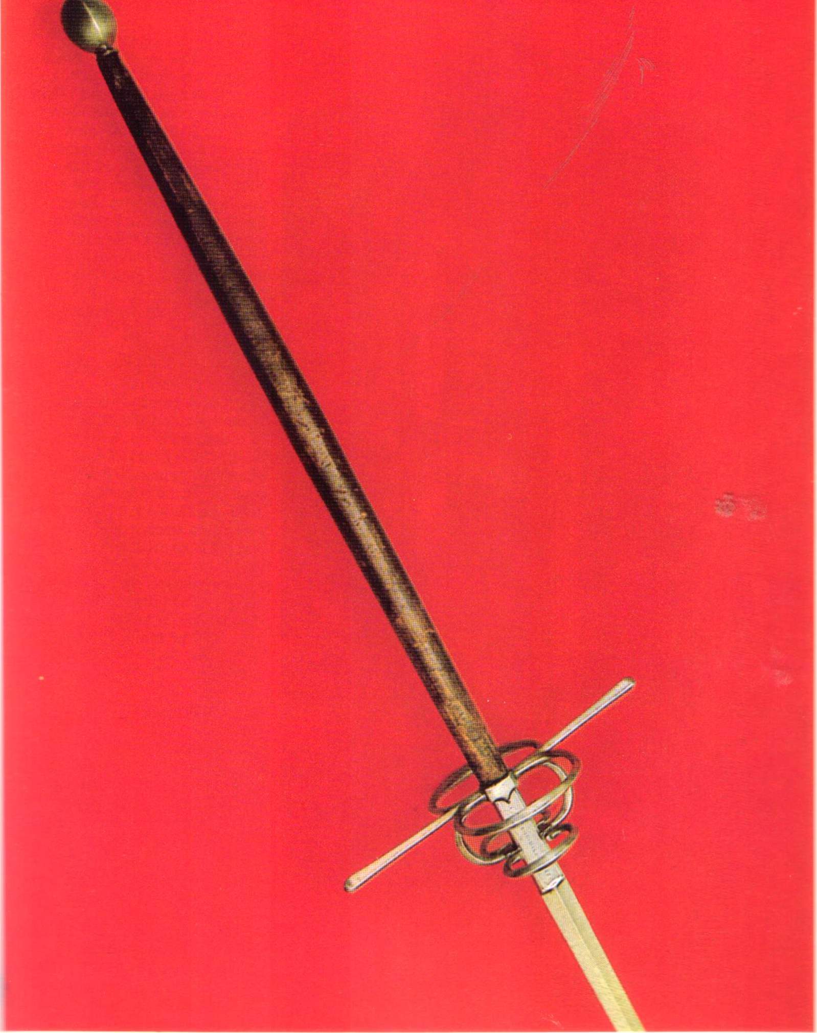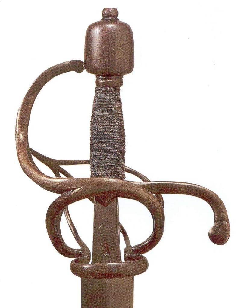 Эсток 1580г . Отличительные характеристики: крестовина с кольцами и плоской восьмиугольной пластиной, рикассо прикрыто обоймой для лучшей фиксации в ножнах. Коническое навершие зафиксировано шайбой продетой в хвостовик. Сохранился оригинальный деревянный черенок покрытый кожей (сильно потерта). Прямой узкий ромбический клинок  длиной 100 см. Это редкий меч недавно обнаружили в Венгрии, но сам он Австрийского типа. Рыцарь образца 1520 г с боевым молотом и эстоком. худ. Якоб Генрих Хефнер-Альтенек