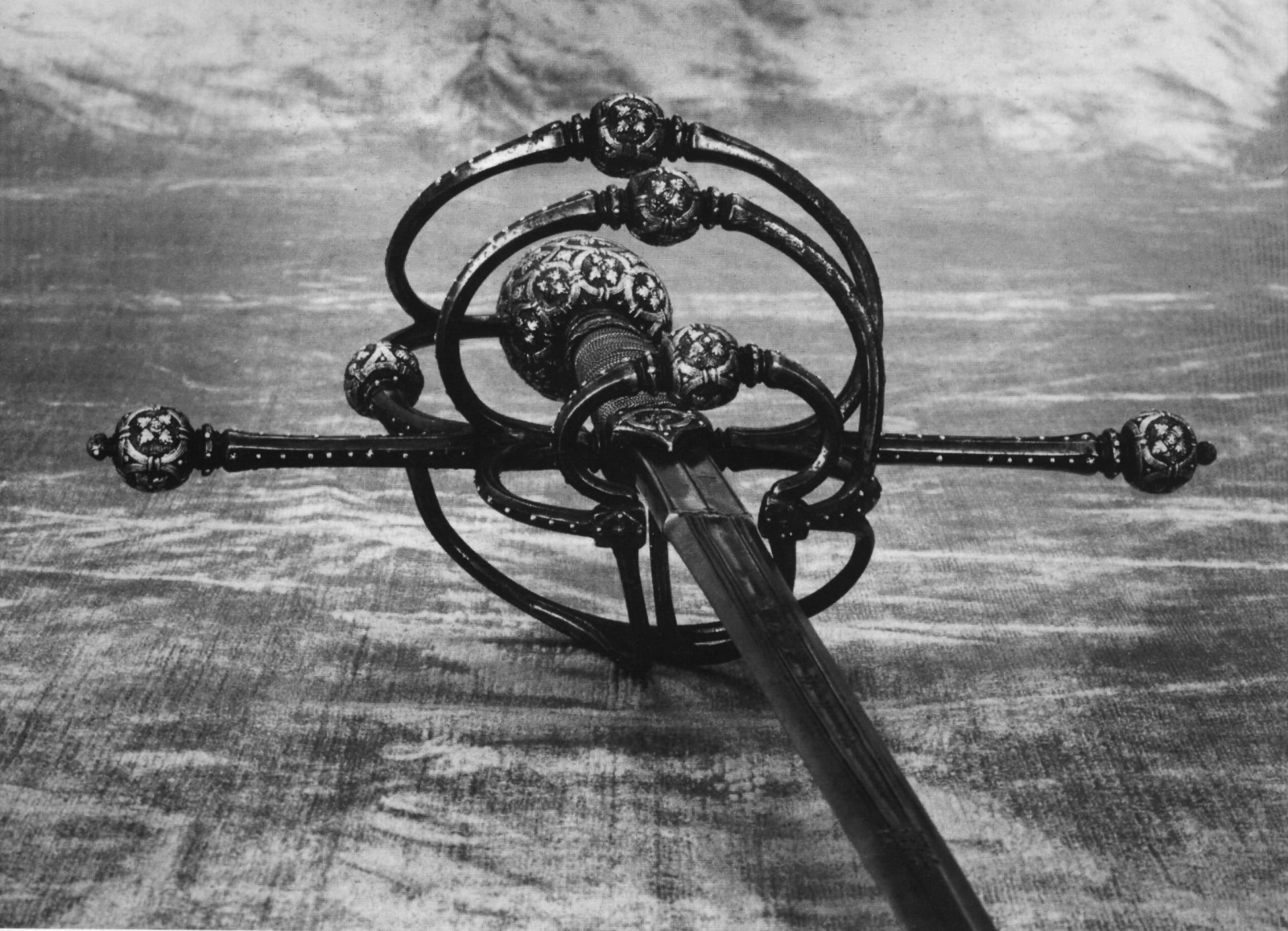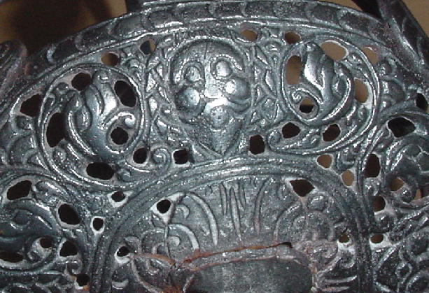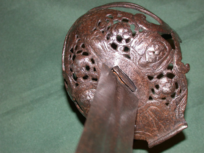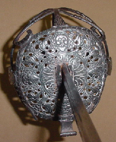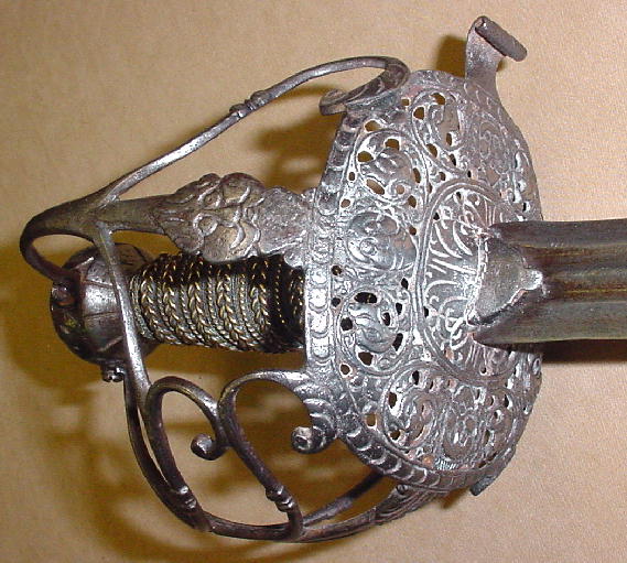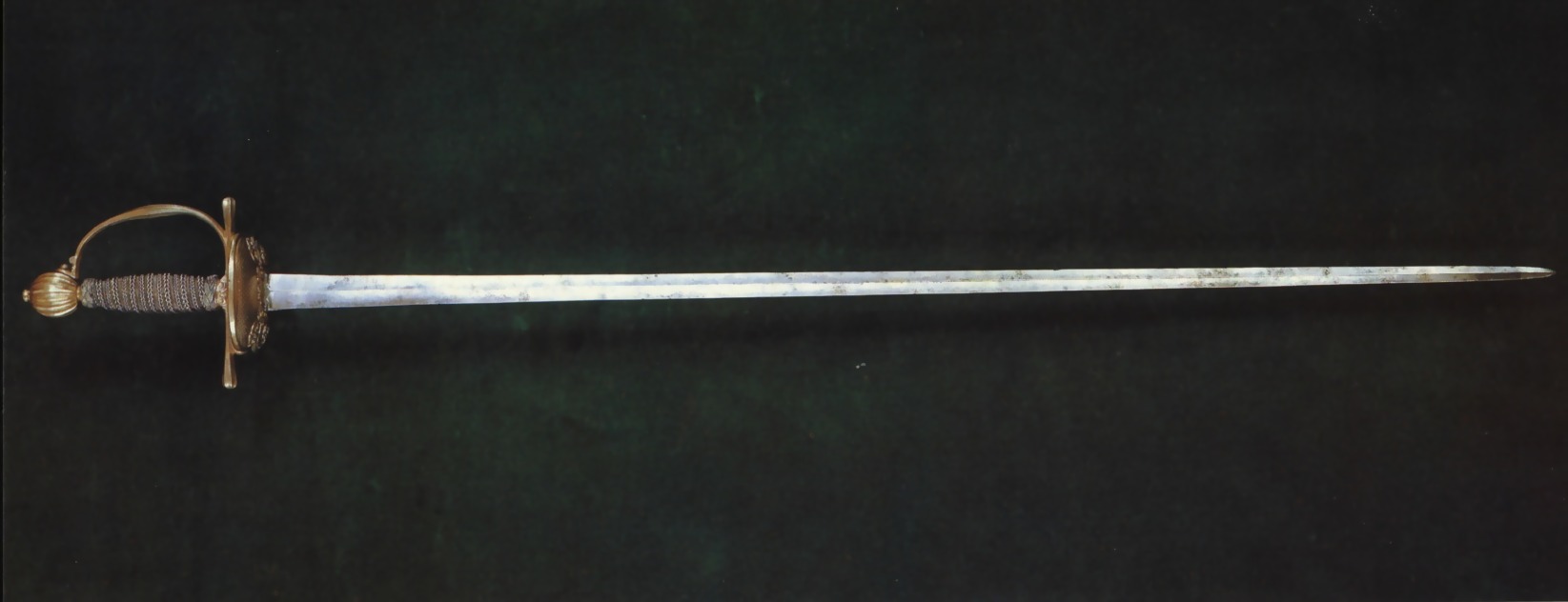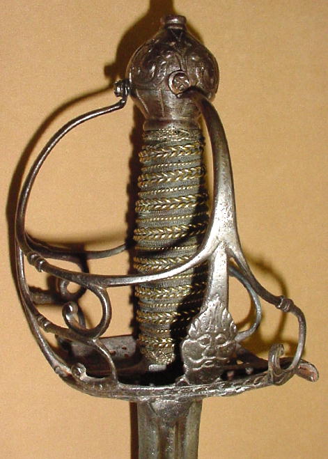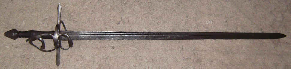 Траурный меч 1640 года. Оплетка черена рукояти сделана из трех видов проволоки. На корзине выгравировано четыре бородатых лица.  Длина клинка 81 см. полная длина 96 см. Прекрасный траурный меч. С сохранившейся оригинальной кожаной оплеткой рукояти. Длина клинка 84 см.