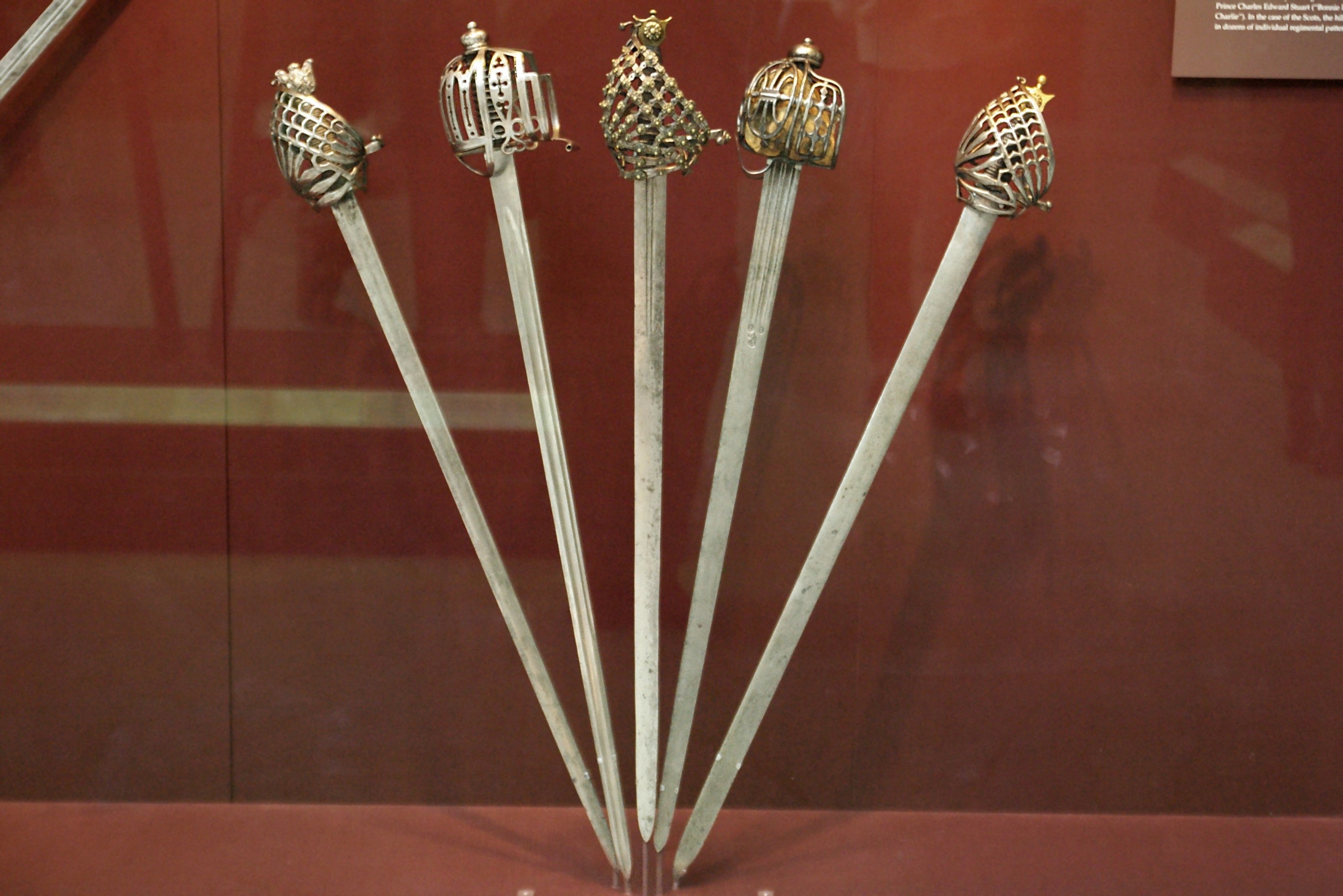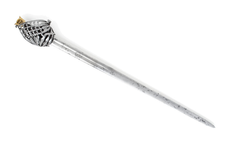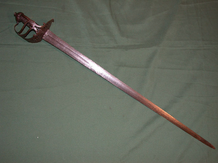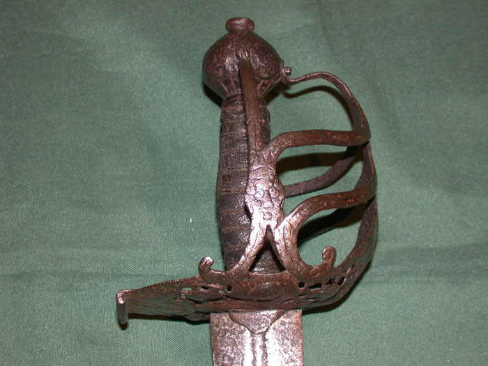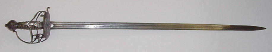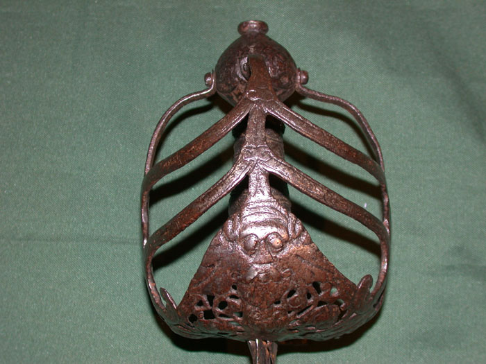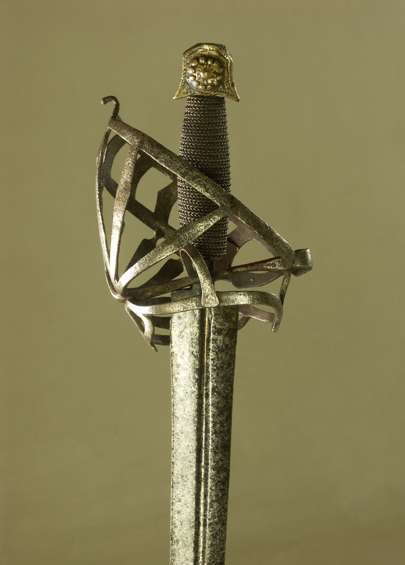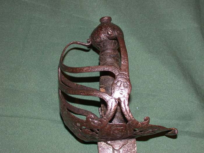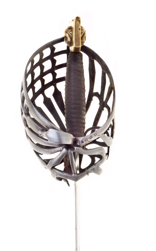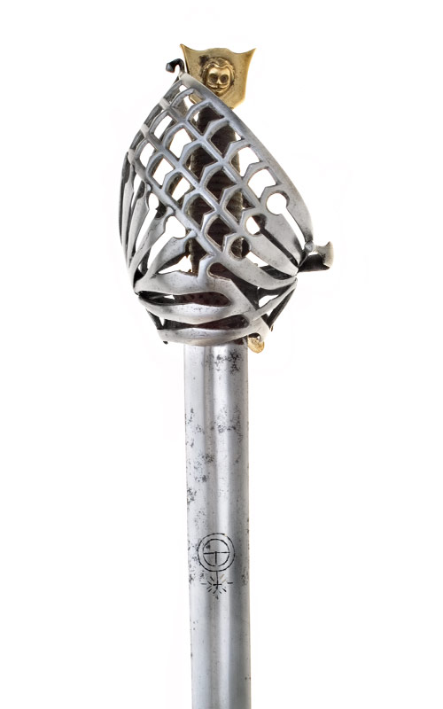 Клеймо в доле клинка: “IHB”. Клинок прямой, обоюдоострый, с долом приблизительно на одну четверть общей длины клинка. Рукоять деревянная, обвита крученой проволокой. Головка медная плоская, фигурная, с розетками по сторонам. Гарда закрытого типа в виде системы пересекающихся плоских дужек, крестовина с изогнутыми и заканчивающимися утолщением концами и кольцом для большого пальца.