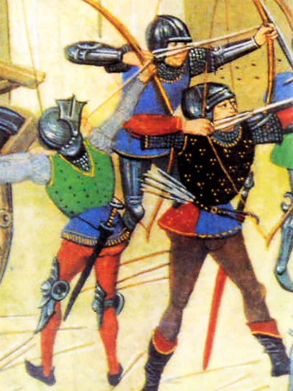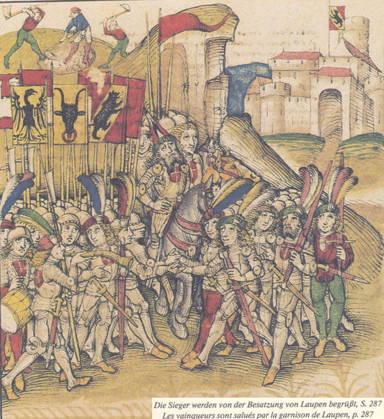 Швейцарские пехотинцы с Цвайнхандерами и с Баззелярдами Выход гарнизона Лаупен, около 1470 г. на фото мечеобразный кинжал Базелярд. Полная длина 78.2 см. длина клинка 65 см, черенок рукоятки (hilt) 10.8 см. Конец 14 - начало 15 века. Меч почти как у рыцаря и длинный рондельный кинжал у английских пехотинцев. Иллюстрация к хронике Фруссара.