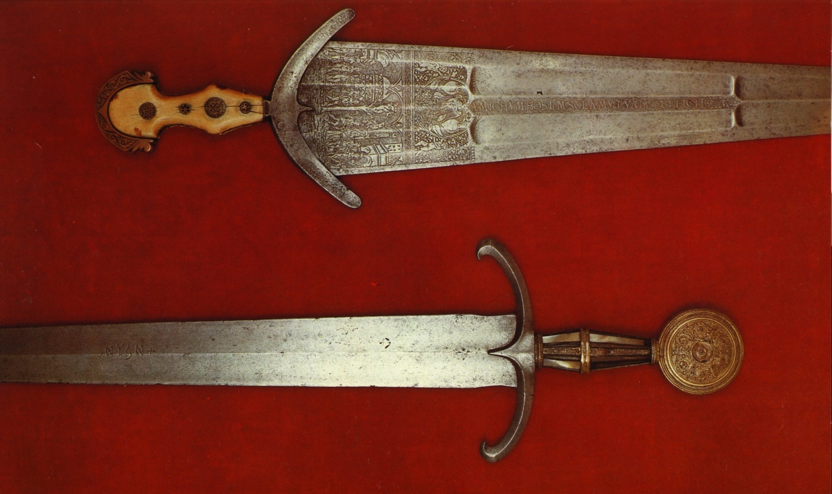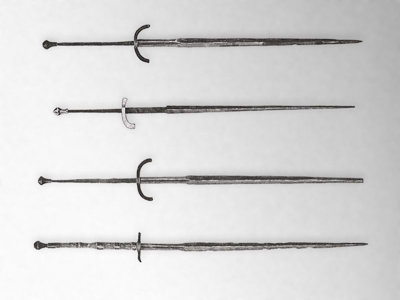 Несколько сохранившихся Скандинавских двуручников 1450-1460 года, вес каждого менее двух кг. Полная длина около 1,5 м Рукоять одного из таких мечей, по Э. Оакешоту XVIIIe. Меч Эсток. 1500 год. Изготовлен предположительно в Южной Германии, рукоять реставрирована, инв. j.Po.2107. Musee de L'Armee. Париж инв. j.11318