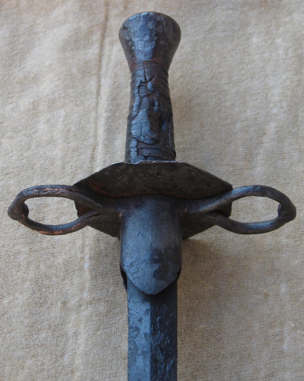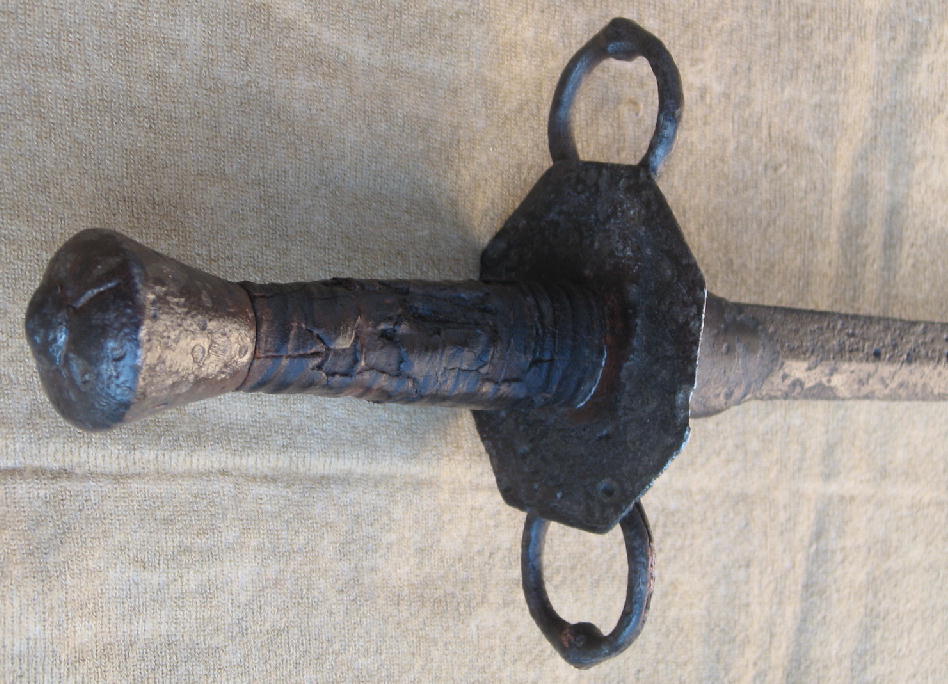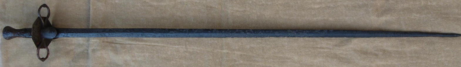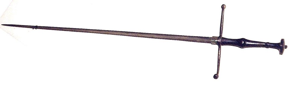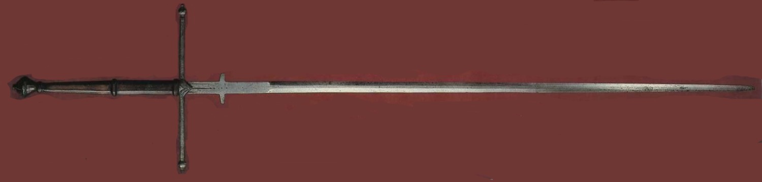 Этот южногерманский меч – то ли эсток то ли эспадон, про этот меч 1500 года можно уверенно сказать что он Panzerstecher, то есть "Протыкатель брони". Хвостовик  рукояти продет в фигурный деревянный черенок.