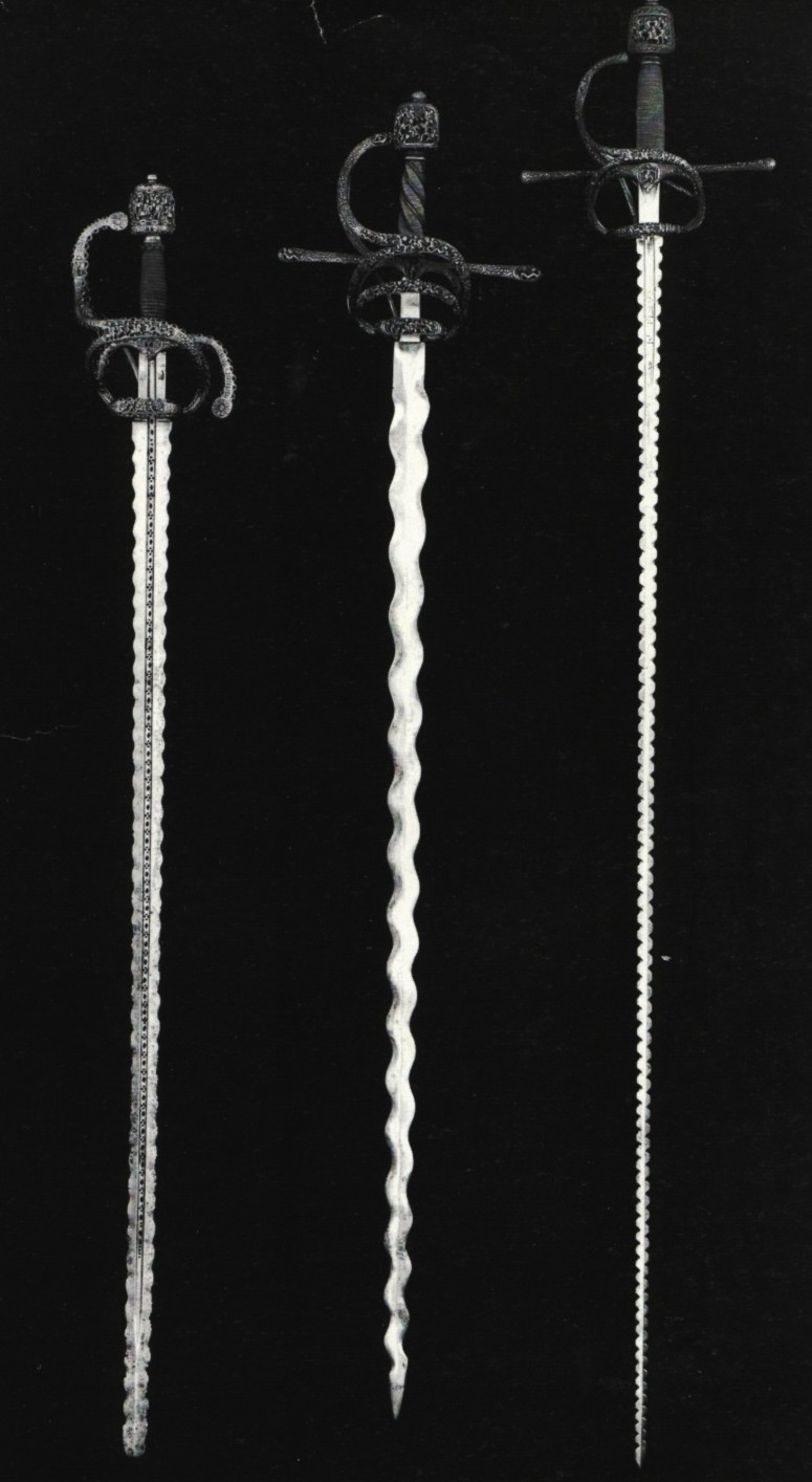 С лева на право: немецкий, испанский, итальянский образцы пламенеющего клинка у шпаг 16 века. German Historic Museum (DHM) Berlin Фламберг, один из многих. Что интересно этот тип мечей считался дорогим и не слишком распространеным, но сохранилось огромное количество на музейных полках и в частных коллекциях. Фламберг 1520 г. Musee de L'Armee. инв. j.11318