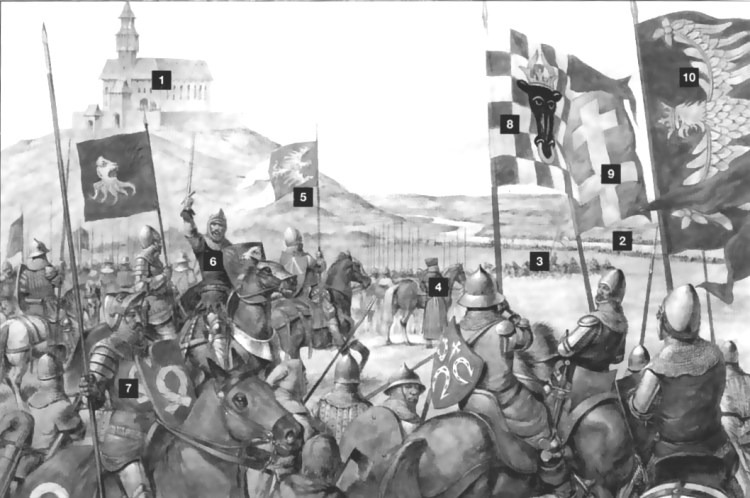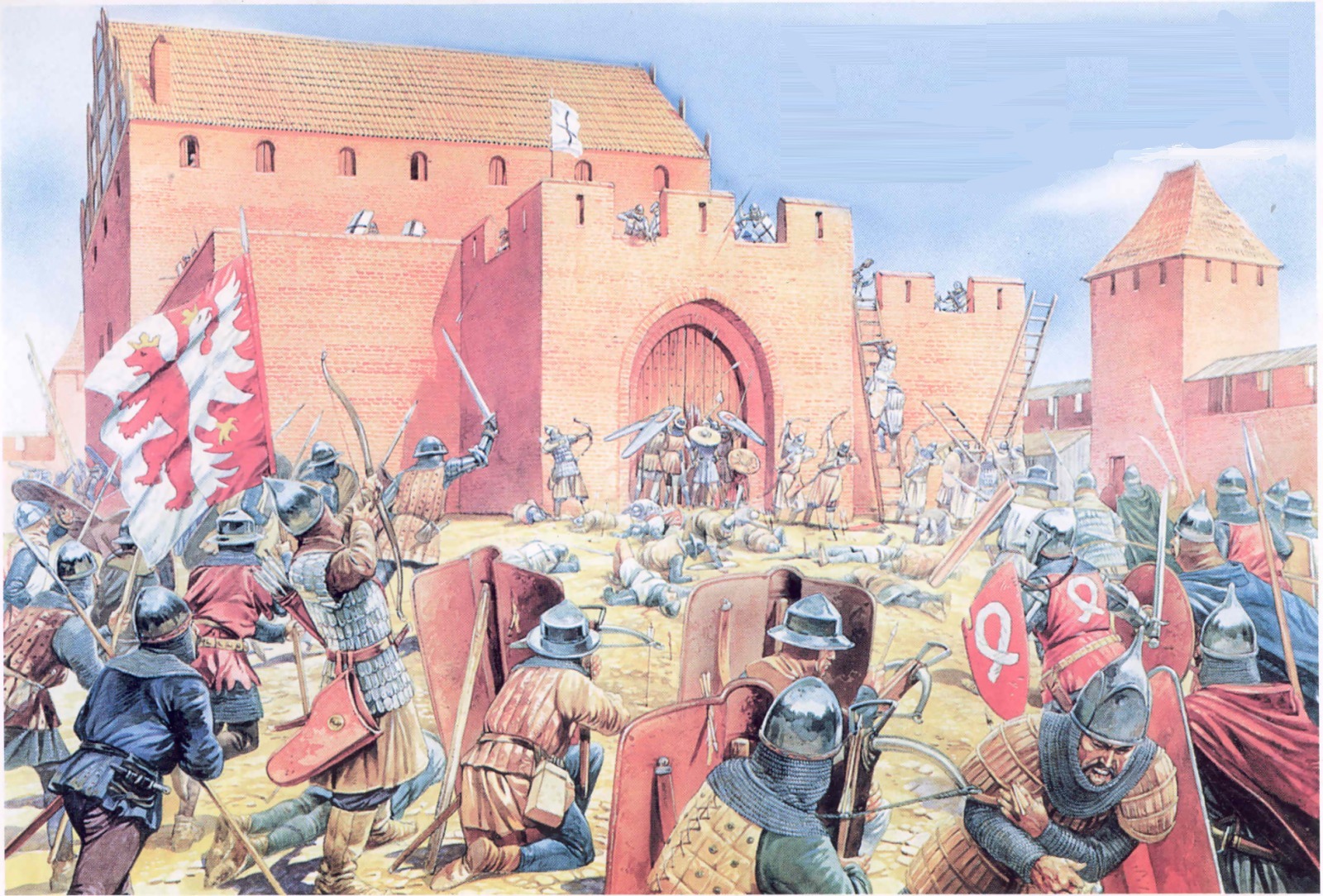 Штурм замка Гильденбург (Дабровно), 1410 год. Польско-литовская армия, вступившая в 1410 году в Пруссию, до сражения под Грюнвальдом сумела взять штурмом замок Гильденбург, который лежал на узком перешейке между двумя озерами. Так как у поляков не было времени па ведение минной войны, замок пришлось брать лобовым штурмом. Знамя слева принадлежит польскому отряду из района Серадза. Эмблема в виде вывернутого платка принадлежит клану Налеч из Неликополыии.