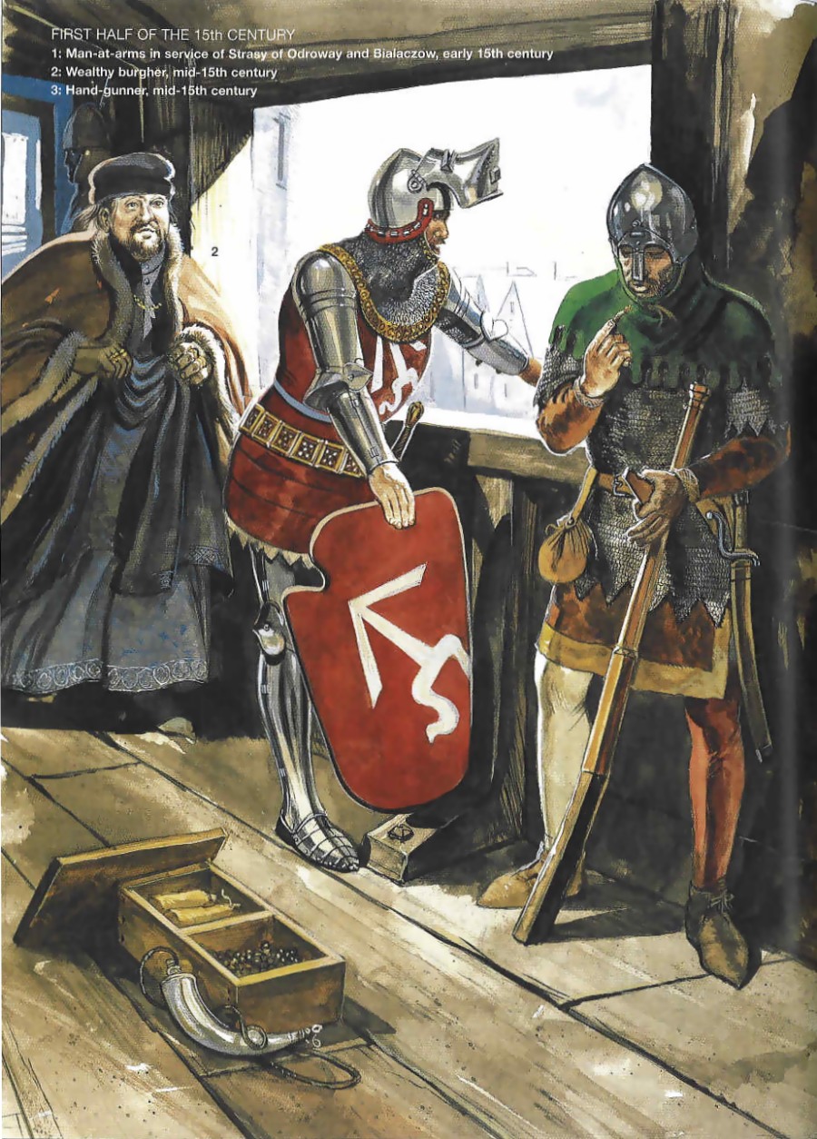 В Польше (но не в Литве) тяжелая конница продолжала доминировать на поле боя на протяжении XV в. Воины все шире применяли белые доспехи местного производства. Этот профессиональный воин отличается от своих западных коллег лишь гербом на щите и сюрко. Такой герб не имел аналогов на западе и характерен только для Польши и Литвы, возможно, он восходит к татаро-монгольским племенным знакам. Бацинет с «собачьим» забралом и декорированной бармицей. Панцирь и налядвянники скрыты под облегающим сюрко. Руки закрыты пластинчатыми наручами, боевые перчатки надеваются перед боем. Ноги также защищены. Под пластинчатыми доспехами поддета кольчуга.