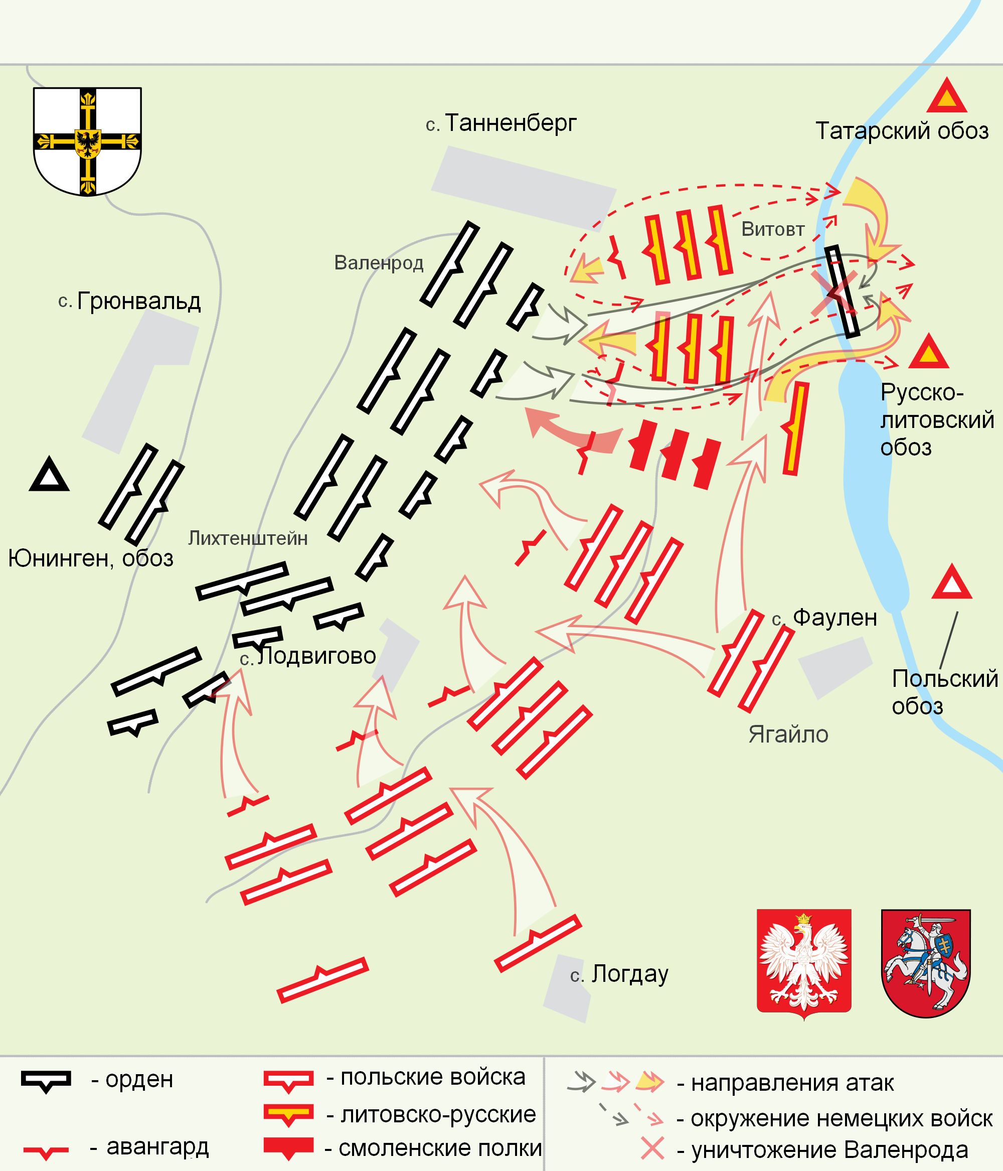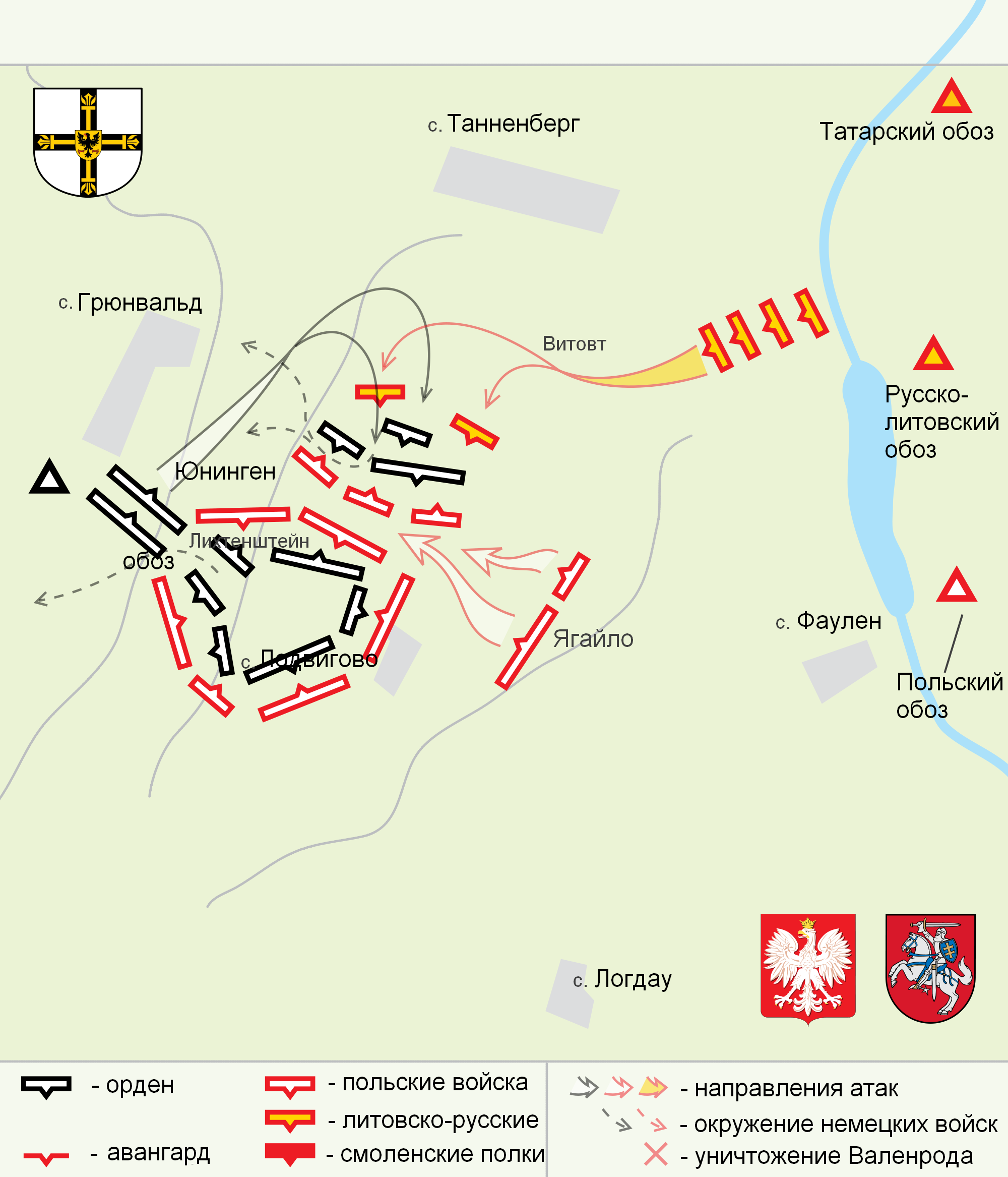 Юнгинген мог нанести улар через линии Валленрода, приказав им расступиться и пропустить его ударные знамена (очень сложный маневр), мог бросить знамена вдогонку за литвинами (это могло принести быструю и решительную победу). Но он выбрал обходной маневр через позиции разбитых литовских хоругвей левым флангом мимо Танненберга с дальнейшим поворотом на юг, чтобы атаковать поляков с их правого фланга. Чем он руководствовался? Возможно, он хотел избежать таинственных «волчьих ям», вырытых накануне по фронту собственных линий, или. возможно, собирался усилить свой удар за счет объединения оставшихся в живых разрозненных рыцарей, находившихся на месте битвы с литвинами. Место удара по полякам было выбрано с оставшеюся неприкрытым литовского фланга.