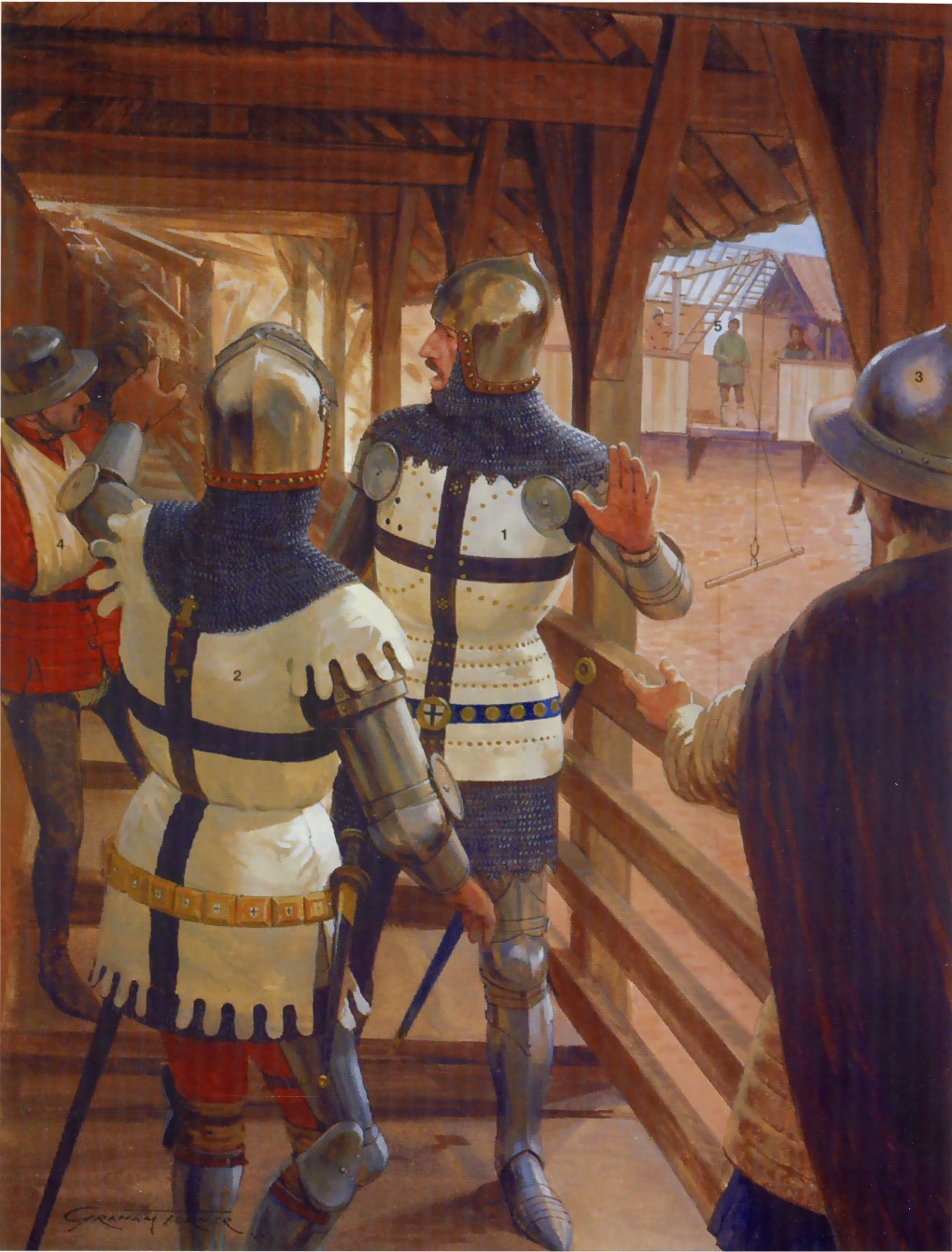 Мариенбург был главным тевтонским замком. Сразу после победы при Грюнвальде польско-литовская армия осадила Мариенбург. Обороной замка руководил комтур Генрихх фон Плауэн. Действия комтура были настолько успешны, что в том же году он стал новым великим магистром ордена (1410-1413). Поляки сконцентрировали свои усилия на юго-восточной стене замка. Стена получила серьезные повреждения, но брешировать ее осаждавшими так и не удаюсь. На иллюстрации Генрих фон Плауэн (1) носит современные доспехи. Снаружи к панцирю приклеена белая накидка с черным крестом. Бацинет с забралом типа «свиная морда». Командира сопровождает брат-рыцарь (2) в похожем шлеме, особенность заключается только в способе подвески забрала. Бело-черная «униформа» представляет собой свободное сюрко. Военный инженер (3), дающий советы по нейтрализации бомбардировки и устранению полученных повреждений носит железную шапку и толстый стеганый жюпон. Раненый (4) скандинавский рыцарь, добровольно поступивший на службу к ордену. Он снял доспехи, за исключением стеганого жюпона, который носит под «белыми доспехами». Его шлем – характерная скандинавская широкополая «железная шапка». Несколько рабочих (5) обслуживают подъемный кран, который обычно использовался для строительства храмов и крепостей.