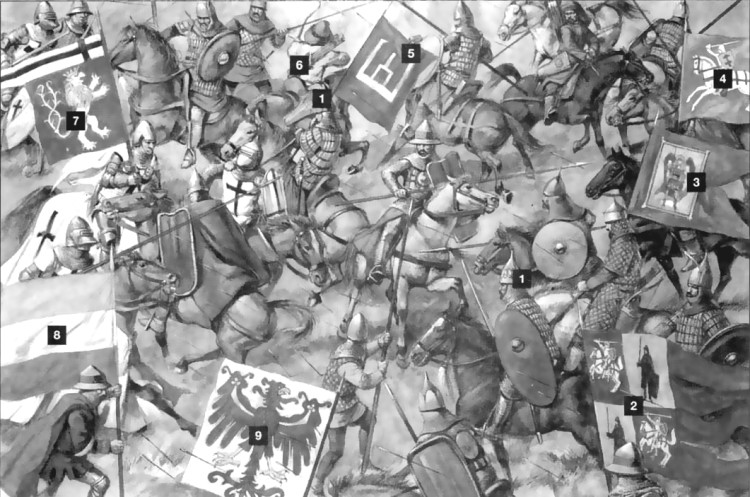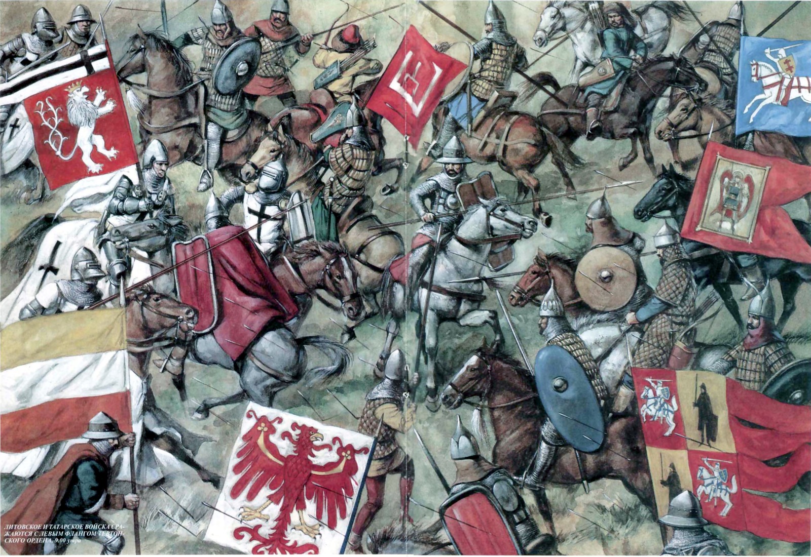 отступления литовцев судьба сражения зависит только от сохранившего стабильность центра польско-литовского строя, состоявшего в основном из наемных контингентов. Считая момент наиболее подходящим, он ввел в бой свой последний резерв – 16 знамен бронированных рыцарей. Хотя одно его знамя состояло из отступивших назад после литовского нападения, остальные 15 были свежими и лучшими подразделениями армии Ордена, еще не принимавшими никакого участия в сражении. Новая атака проводилась силами приблизительно одной трети отборных сил Ордена и представляло собой серьезную угрозу польскому королю, который фактически резервов уже не имел.