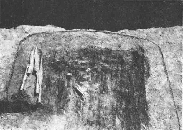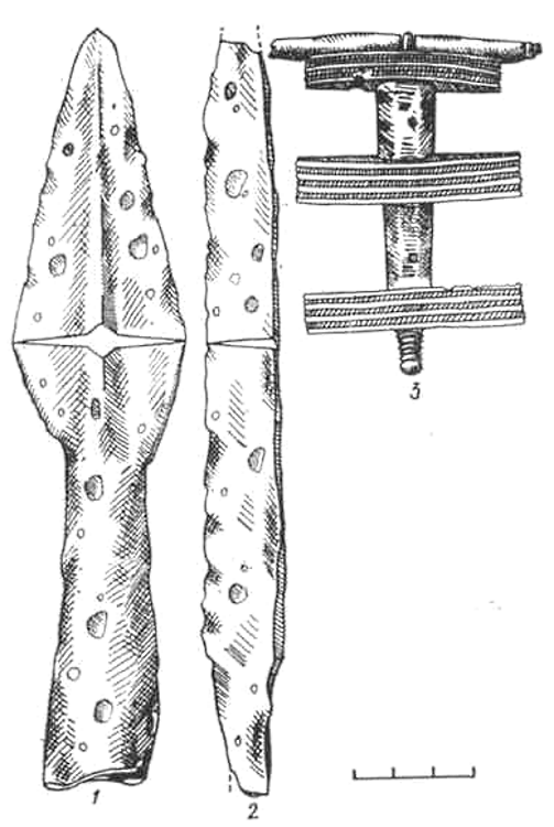 В погребениях II-IV вв. Западной и Средней Литвы и Центральной Жемайтии наконечники копий чаще всего обнаруживаются в изголовьи (Гинтарай, Застаучяй, Жа-дувенай, Курмайчяй, Лауксвидан, Паланга, Рудайчяй I и II и др.). В северной части Литвы (Муоришкяй) копья найдены и в ногах, вместе с орудиями труда. Копья и топоры в погребения клались так, что лезвие топора соприкасалось с голенью, а перо наконечника — с обухом топора. Древко и топорище обращены к изголовью (128, с. 90). С конца IV-V в. копий в погребениях становится больше, формы и размеры наконечников — разнообразнее. На всей территории Литвы преобладает обычаи копья в погребения класть наконечниками в изголовья умершего. Только в Восточной Литве в погребениях с трупоположеннями конца IV-начала V в. наконечники встречаются и в изголовьи (Мигоннс, курган № 14) и в ногах (Дягсне-Лаботишкес, Молетский р-н, курган № 5; Таурапилис, курганы № 1, 5, 9 и погребение в раскопе Н). В других частях Литвы погребения с наконечниками копий у ног — редкое исключение. Например, копья с наконечниками у ног умерших обнаружены только в могильниках Мауджёрай, в погребениях № 6, 38, 111, и Яунейкяй, в погребении № 22. В начале обряда трупосожжения копья в погребения клали сверху, на сожженные кости, вместе с другим погребальным инвентарем, только после трупосожжения. На это указывают остатки древков во втулках наконечников и то, что сами наконечники не обожжены. Иногда их просто втыкали в землю остриями вниз рядом с другим инвентарем и кремированными костями (рис. 2,3).