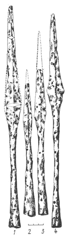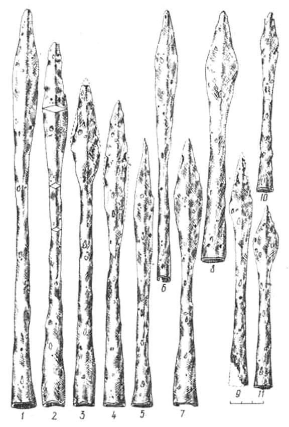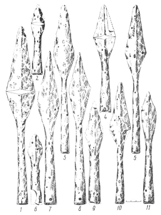 Длина наконечников 10,5-40 см, ширина пера 1,5-3,4 см. Поперечное сечение пера в форме вытянутого ромба или, реже, линзовидное. Втулки большинства наконечников у пера в поперечном сечении становятся ромбовиднымн. Перо во втулку входит плавно, выявленная ромбо-видность пера постепенно исчезает. Наиболее характерная черта этих наконечников – длинные втулки. Соотношение втулки и пера от 2:1 до 5:1.