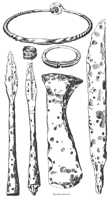 1. Акмяняй, кург. № 3. погр. № 3; 2, 4, 12. Застаучяй, кург. № 7. погр. № 3, 16; 3, 8, 10, 11. Шаркай, случ. нах.. погр. № 31; 5. Марвеле. случ. нах.; 6. Шяудаляй, случ. нах.; 7. Кашучяй, кург. № 29; 9, 13. Жодувенай, погр. № 30