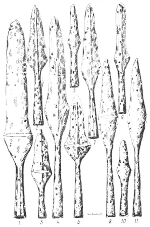 Самые ранние из таких наконечников найдены в Центральной Жемайтнн и в северной части Литвы, это указывает на их генетическую связь с наконечниками подтипов ІА, Б и В. Например, в Застаучяй, в погребении № 17, найден наконечник длиной 19 см с пером шириной 3,5 см, бронзовая шейная гривна с конусовидными концами и ленточный браслет с треугольным поперечным сечением. В Днржяй, в погребении № 3, обнаружен наконечник длиной 17 см с пером шириной 3 см, бронзовый ленточный браслет и другие изделия IV в. (145, рис. 5). Это один из самых ранних наконечников подтипа ІГ. Наиболее совершенная форма у наконечников, обнаруженных в погребениях V-VII вв. в курганном могильнике Няравай-Григишкес. Так например, в кургане № 13, в погребении № 2, найден наконечник копья длиной 35 см с пером шириной 5,6 см (рис. 9:1), в кургане № 40, в погребении № 1 — наконечник длиной 30 см с пером шириной 4,5 см (рис. 9:8), а в кургане № 19, в погребении № 1 — длиной 28 см с пером шириной 4,5 см. С VII в. эта форма наконечников копий в восточной части республики постепенно исчезает, уступая место наконечникам с иволистообразной формой пера.