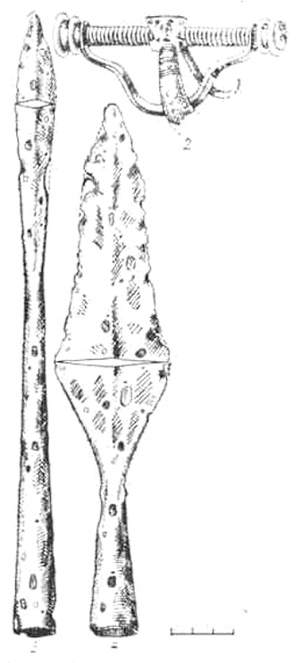 Как в Литве, так и на других территориях балтских племен наконечники копий с пером ромбовидной формы широко распространялись с первых веков н. э. Поэтому можно утверждать, что наконечники этой формы происходят с территории балтских племен.