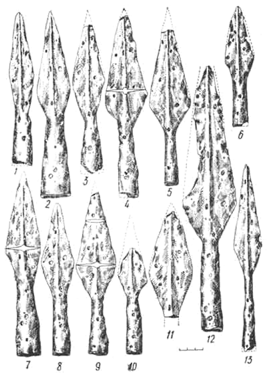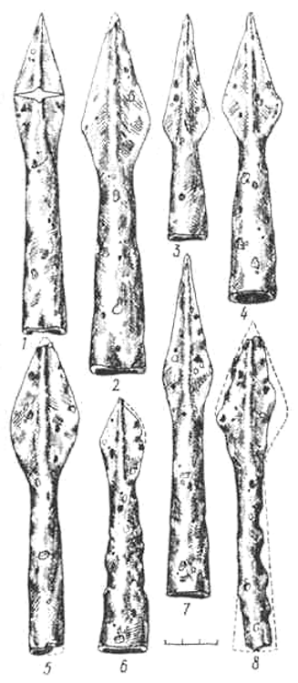 Самые ранние наконечники этой формы встречаются в Латвии и Дании, где они датируются III в. Поэтому вполне возможно, что наконечники с территории Латвии распространились в соседних землях балтских племен Восточной Прибалтики, а из Дании — и на других североевро-пейских территориях. В Центральной Европе наконечники этой формы появляются около 700 г. н. э. (166, с. 175).