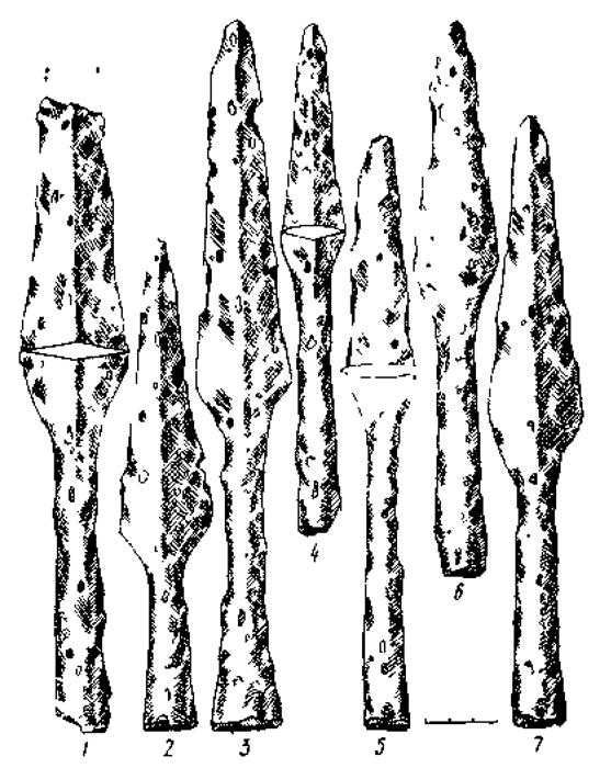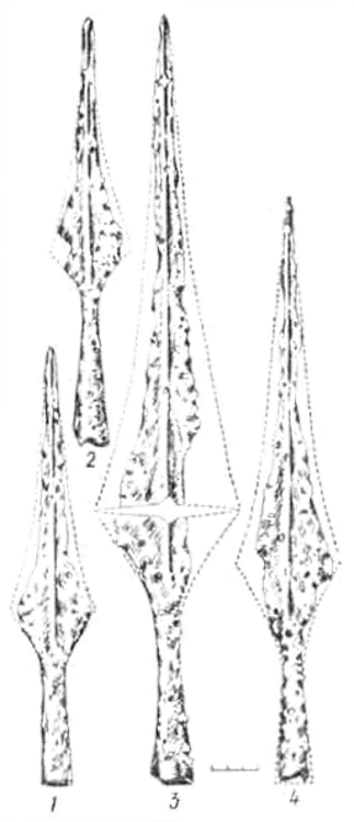 Подобные наконечники найдены и на соседних с Литвой территориях балтских племен. Например, в Латвийской ССР — в могильниках Маскатужн, Слате, Яун-Серпнлнс (137, с. 510-513, рис. 77:2, табл. XXXVII: 4, 5, 7; 119, табл. 27:7). Обнаружены они также и в бывшей Восточной Пруссии, в местности Гох-Шнакейкен (67, с. 25, рнс. 3:4). Датируются первой половиной I тысячелетия и. э.