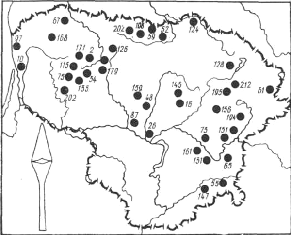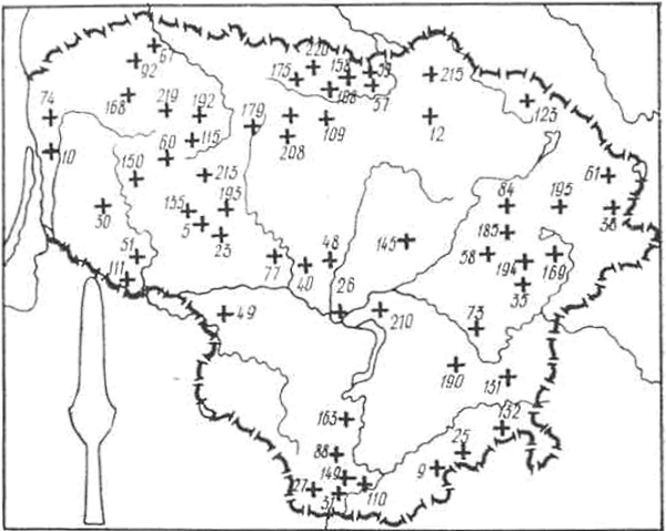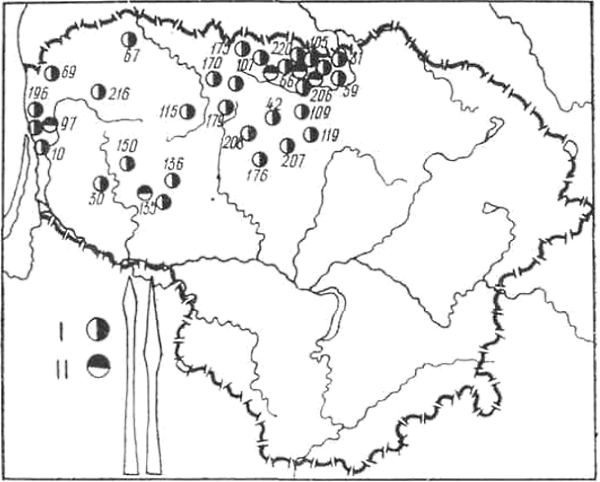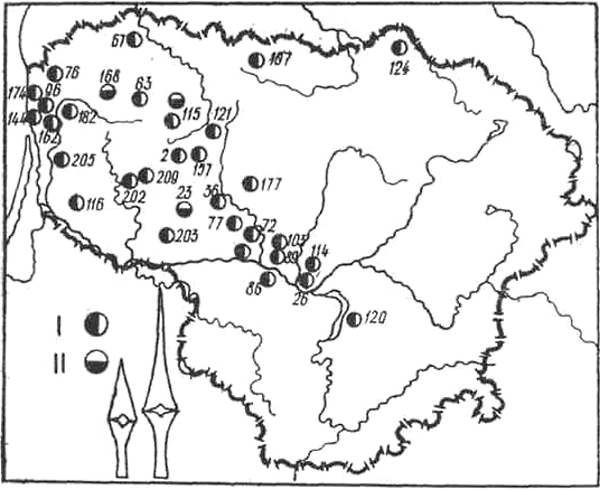 III-IV вв. — Бандужяй (оба — в Клайпедском р-не) (143, с. 96, рис. 3), Лаздннинкай (59), Пришманчяй (146; 147, с. 179, рис. 1-3), Рудайчяй I и II (131; 132) (все — в Кретингском р-не) и Сенкай (Клайпедский р-н) (130). В других могильниках западной части Литвы, например, Барздунай (Шилутский р-н) (51, с. 116), Гинтарай (136), Падваряй (83, с. 46), Рякяте (148) (все — в Кретннгском p-не), Шернай (Шнлутский р-н) (49), найдены отдельные экземпляры наконечников копий первой половины I тысячелетия и. э. Данные о количестве наконечников копий, найденных в погребениях в различных частях территории Литвы, приводятся ниже:
