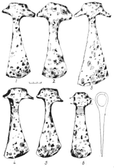Если боевые орнаментированные топоры по форме трудно отличимы от рабочих топоров середины и второй половины I тысячелетия н. э., то боевые топоры со щека-вицами-выступамн уже имеют своеобразную форму: у них массивный обух, длинные щекавнцы-выступы, узкое туловище и расширяющиеся в обе стороны лезвия. Некоторые нз них орнаментированы (рис. 31:4, 6).