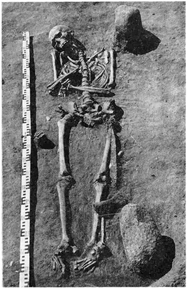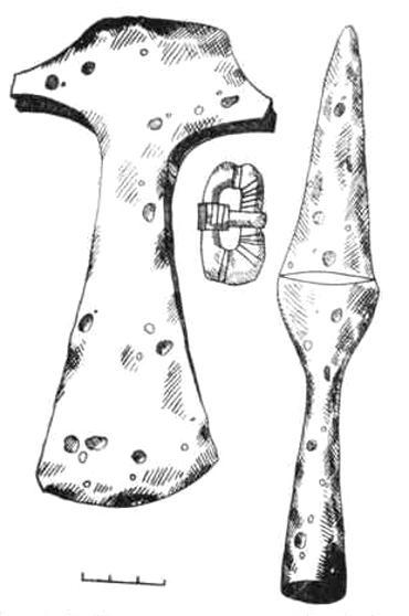 Одним нз самых древних боевых топоров со щекавицами-выступами нужно считать топор, обнаруженный в 1907 г. в кургане № 2, в погребении № 1 с трупоположением Цегельняйского курганного могильника (Игналинский р-н). Вместе с топором длиной 17 см, лезвием шириной 6,3 см, отверстием для топорища размерами 3,7×2,8 см найдена часть бронзовой арбалетовндной фибулы, 3 бронзовые пряжки, наконечник копья с пером иволисто-образиой формы и остатки костяных гребней, датируемые V в. (31, с. 187-188, рис. 1:1-5). В упомянутом могильнике Таурапилис, в кургане №6, обнаружены скелеты мужчины и коня, захороненные в одном месте. Погребальный инвентарь: боевой топор со щекавицами-выступами длиной 17,6 см, с лезвием шириной 6 см и отверстием для топорища размерами 4×3 см, серебряная шейная гривна с тордированной дужкой с пластинками на концах, заканчивающимися дырочкой и крючком, 2 бронзовых спиральных браслета, железная овальная пряжка, нож. Конь взнуздан удилами. Это погребение датируется концом V -началом VI в. (193, с. 38). Еще 1 такой топор в этих курганах был обнаружен в 1910 г. (193, с. 37; 11, с. 75). VI -началом VII в. датируется боевой топор из курганов Ре-кучяй. В погребении с трупосожжением он обнаружен вместе с наконечником копья с профилированным пером и с бронзовой пряжкой (31, с. 188, рис. 1:6-8) (рис. 32). В Вилконисе (Шальчннинкский р-н) такой топор найден в погребении V-VII вв. Боевые топоры, обнаруженные в Жвирбляй (Вильнюсский р-н), в Магунай (Игналинский р-н) (221, рис. 14), в Скинейкяй (Зарасайский р-н), точнее датировать невозможно. Топор нз Скинейкяй к тому же в очень плохой сохранности — с обломанными щекавицами-выступами. Еще 5 депаспортизированных топоров находятся в фондах ИЭМ и КГИМ. Один из них, по-видимому, обнаружен в Таурапилисе.