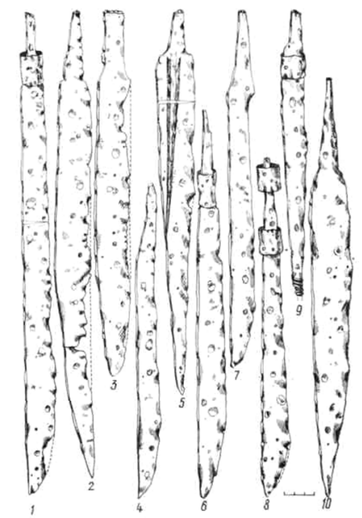 Следует отметить, что боевые ножи широко применялись также и в начале II тысячелетия в западной части Литвы, где их обнаруживают в кожаных и деревянных ножнах с бронзовыми оковами, обильно украшенными геометрическим орнаментом (215, с. 217-219).