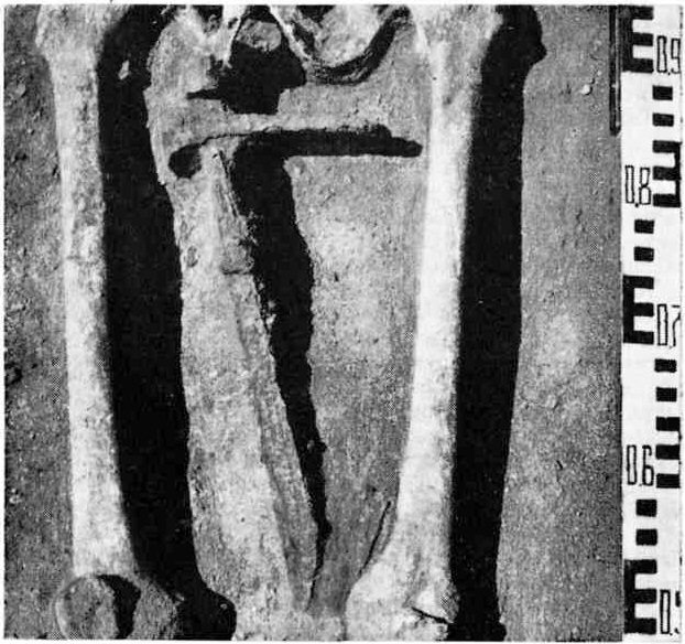 В других погребениях курганных и грунтовых могильников с трупоположениями положення боевых ножей не отличаются от вышеописанных. Например, в Таурапилнсе, в кургане № 1, боевой нож лежал у пояса с левой стороны (193, с. 33, рнс. 35). В Акмяняй – найден с левой стоной костью и т. д. В погребениях с трупосожжениями это оружие обнаруживают над кремированными костями или среди них вместе с другим погребальным инвентарем.