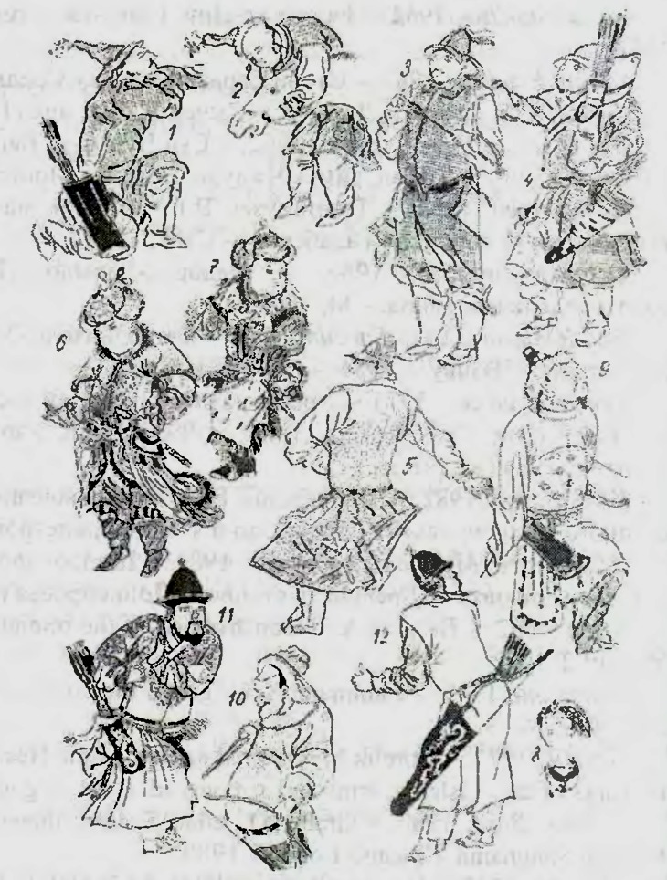 Особенно интересен наряд минского императора Сюаньдэ (Сюаньцзуна), правившего в 1426-1435 гг.: он и его придворные всегда одеты в полный монгольский костюм, со всеми его признаками и деталями (Табл. IV: 11, 12), причем не только на охоте, что было, видимо, совершенно естественно, но и во дворце. Характерно, что его любимое одеяние – халат первого монгольского вида с отрезной талией и заложенный складками подола (Табл. IV : 11). Это, видимо, не случайно: халаты с этой деталью были самым торжественным одеянием в минское и в цинское время (Сычев Л.П., Сычев В.Л., 1975, с. 71, 72; Чжоу Сюн, ГаоЧунмин, 1984, Илл. 261, 267, 268, 295, 296, 308, 309).