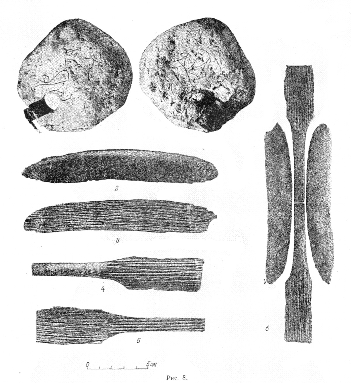 Как и у первой пары, вся внутренняя желобчатая поверхность этих пластин покрыта глубокой штриховой нарезкой для склейки с деревянной основой лука. Такая же нарезка покрывает наружную сторону широких концов утих накладок (рис. 8, 4, 6), а также и боковые стороны узких концов. Гладкой оставалась лишь внешняя поверхность узких концов пластин в месте охвата их рукой. Ширина узких концов этих накладок– 1 см, толщина пластинок – 3-4 мм Концы накладок имеют ровный, прямой срез или отпил.