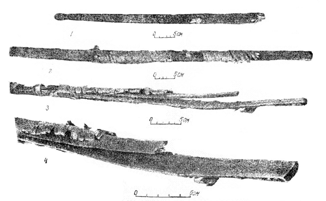 Обломок представляет собой одно из двух вибрирующих плеч или рогов лука52, в которых заключалась вся упругость и метательная сила лука. Этот обломок состоит из двух прекрасно обработанных и подогнанных друг к другу длинных планок из различных пород дерева (можжевельника и березы), очень прочно склеенных между собой плоскими сторонами и тщательно оклеенных полосками бересты (рис. 9, 2–4). Со стороны не сохранившейся рукояти обломок обгорел во время пожара, а конец лука с вырезом для тетивы не уцелел, хотя, судя по прямому, ровному обрезу планки из можжевельника, он был. Пролежав в земле около 800 лет. обломок лука настолько хорошо сохранился, что обладает еще значительной упругостью и способностью пружинить. Несмотря на огромную тяжесть трехметрового слоя земли обломок лука не распрямился, не утратил упругость и характерный для сложных луков изгиб конца в обратную сторону (рис. 9, 2, 3).