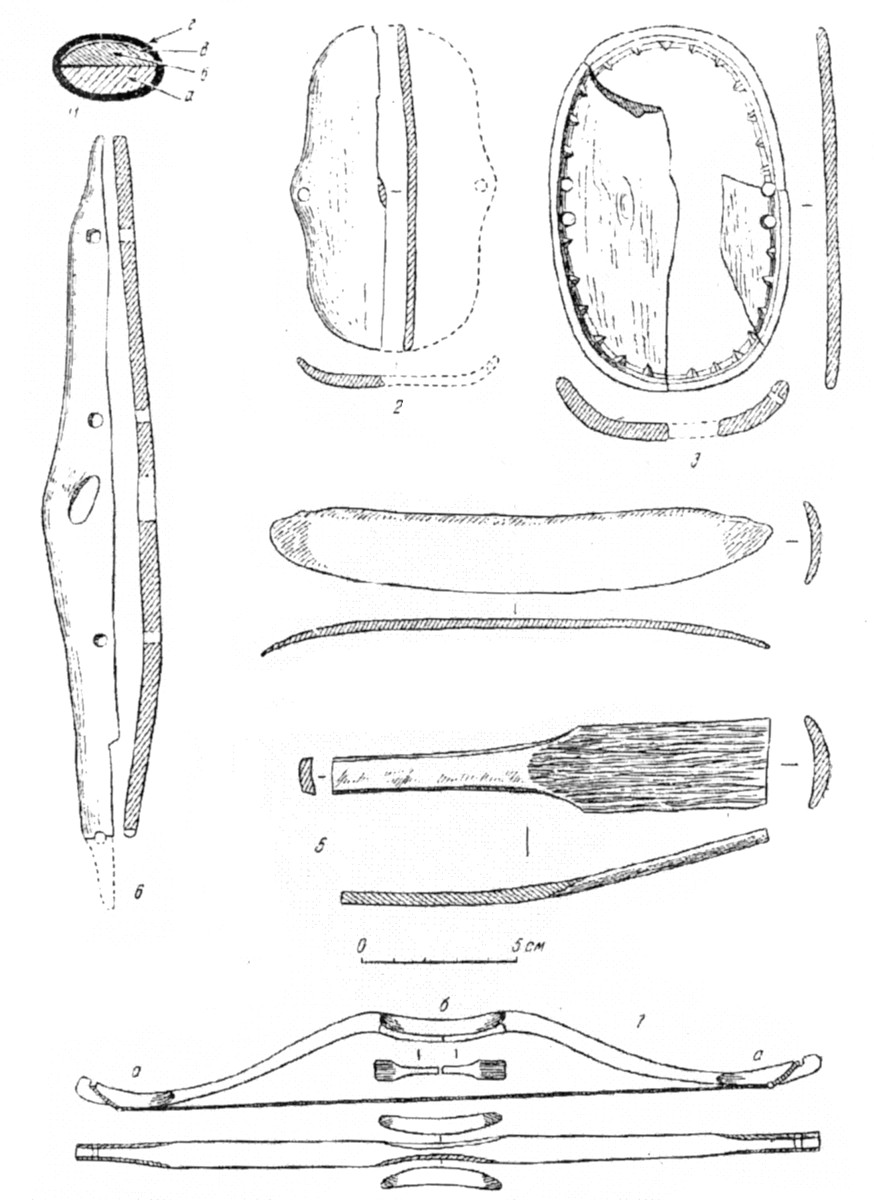 В 1954 г. найдены 2 тонкие (толщина – 1 мм) костяные накладки с циркульным орнаментом, по всей вероятности, от налучий (футляров для лука). Одна из них почти целая, от другой сохранилось около половины (рис. 11, 3,4). Эти накладки располагались на концах налучий; их приклеивали и пришивали к коже или иному материалу, являвшемуся обтяжкой налучий, причем к ним примыкали подобные же, но других размеров накладки. Следы склейки и штрихи, специально для этого процарапанные по краям накладок, ясно видны на фотографиях, как и следы прошивки (рис. 11, 3). Изгиб целой пластинки не оставляет сомнений, что налучья предназначались для сложных луков.