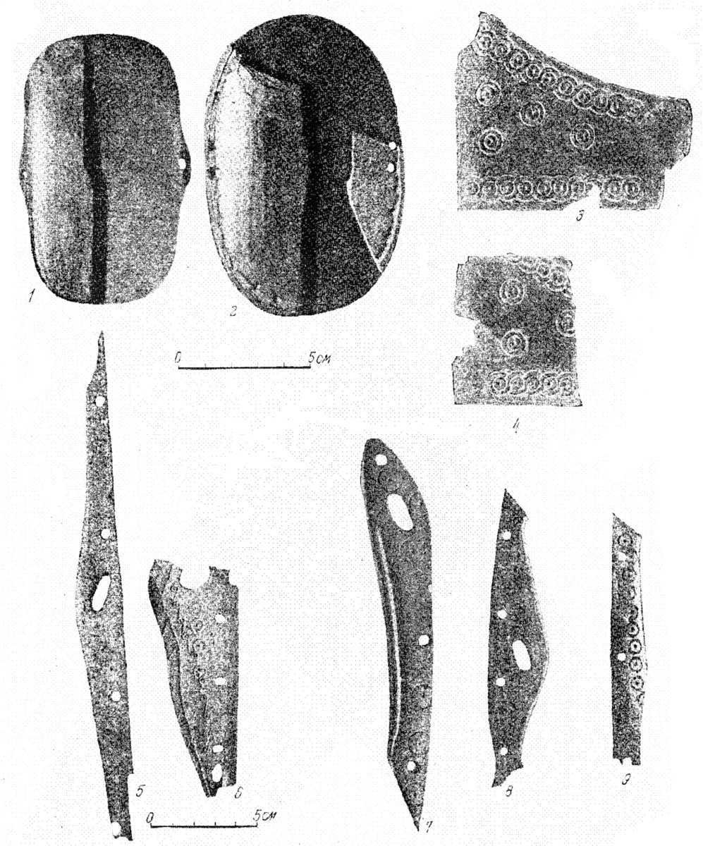 Древнейшая из этих предохранительных пластинок найдена в слое середины XI в. От нее сохранилась почти половина, позволяющая установить не только первоначальную форму пластинки, но и ее размеры. Форма – овальная, с двумя плавно выступающими боковыми крылышками; в них имеются небольшие круглые отверстия (диаметр – 4 мм) для ремешков или тесемок, с помощью которых пластинка привязывалась к запястью. Все края пластинки притуплены, закруглены и отполированы для того, чтобы они не врезались в руку и не поранили ее во время удара тетивы при стрельбе. У дырочек едва заметны вмятины – результат стертости от ремешков. Первоначальная длина этой предохранительной пластинки – 10,5 см, ширина – около 6,5 см, толщина – 2,5 мм.