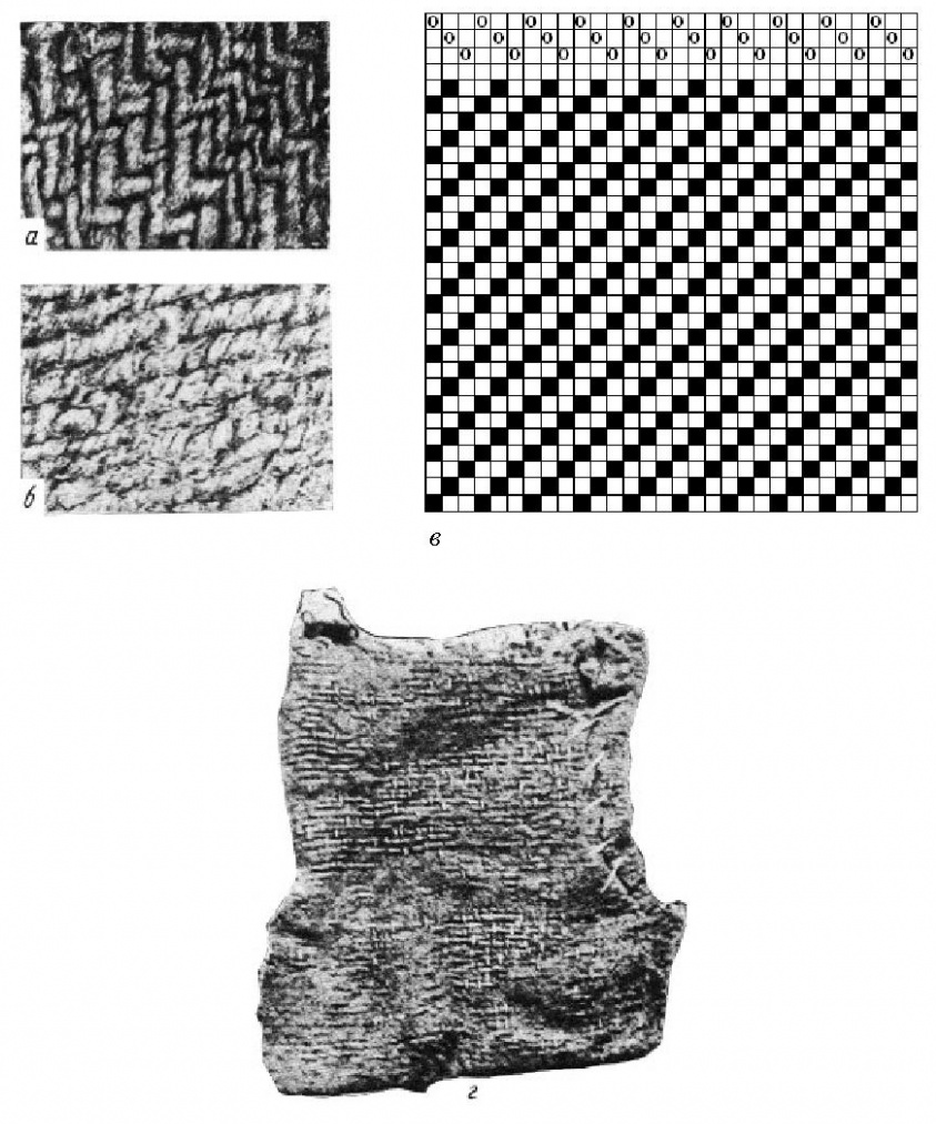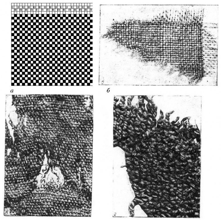 Полотняное переплетение 1/1 (рис. 11, а) — это простейший вид переплетения нитей в ткани. Полотняное переплетение характеризуется наименьшим количеством нитей утка и основы, соединенных в раппорте10. Для изготовления ткани с полотняным переплетением на горизонтальном ткацком станке с подножками достаточно двух ниченок, приводимых в движение подножками, подвешенными на коромыселке или блочках. На вертикальном ткацком станке с гирьками или двумя валиками или же примитивном горизонтальном ткацком станке без подножек достаточно одной петельковой полуниченки и доски, отделяющей четные нити от нечетных. Лишь в том случае, когда ткань полотняного переплетения имеет очень густую основу (например, шерстяная ткань Н-58/2830 с густотой основы 24 нити на 1 см), употребляются четыре ниченки, попарно привязанные к двум подножкам. Все ткани из растительного волокна, найденные в Новгороде, имеют полотняное переплетение.