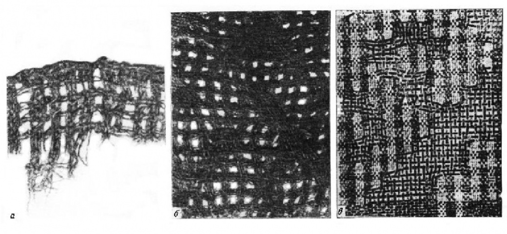 Эти ажурные ткани относятся к типу простых одинарных ажурных тканей с сеткой, образованной переплетением шерстяных и холщевых нитей, а не к двуслойным тканям.