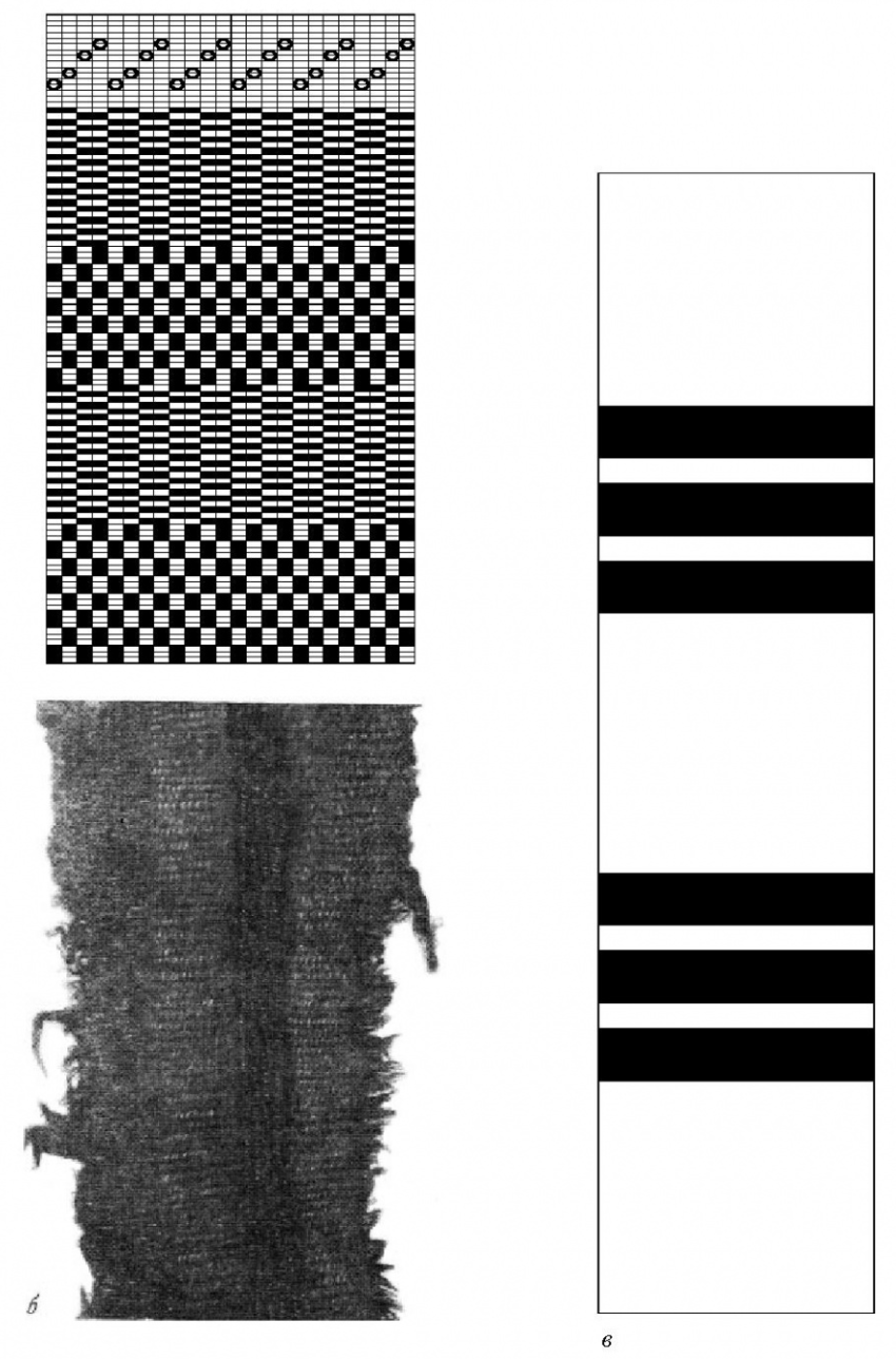 б — полосатая ткань Н-52/18, пл. кв. 132(2/2+ 1/1); в— схема полосатых поясовН-55/10141, ярус 14(2/2+ 1/1)