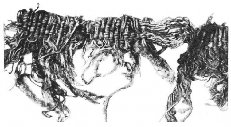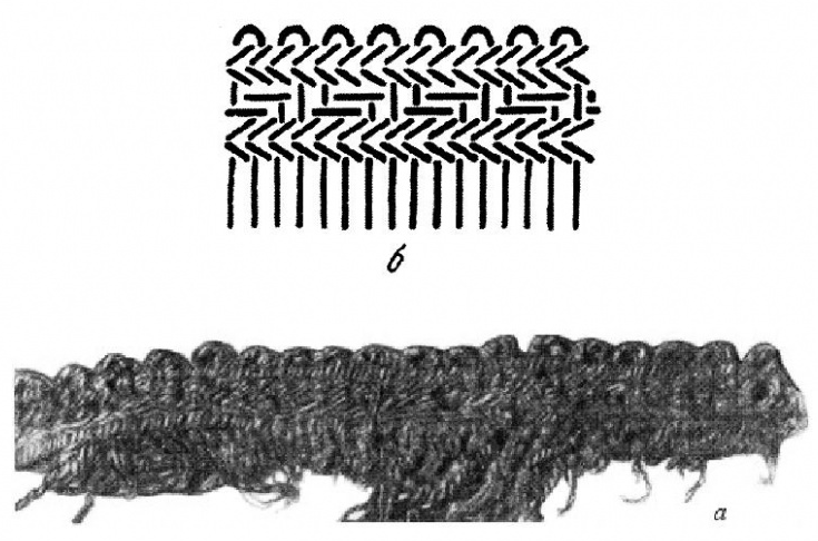 Ткани с округлыми кромками, встречающиеся в материалах раскопок, имеют большое значение, так как позволяют сделать некоторые выводы, касающиеся ткацкого станка. Наличие таких кромок указывает на то, что соответствующие ткани были изготовлены на вертикальном ткацком станке. Но к этому вопросу мы вернемся в той части нашего исследования, которую мы посвятили рассмотрению ткацких станков.