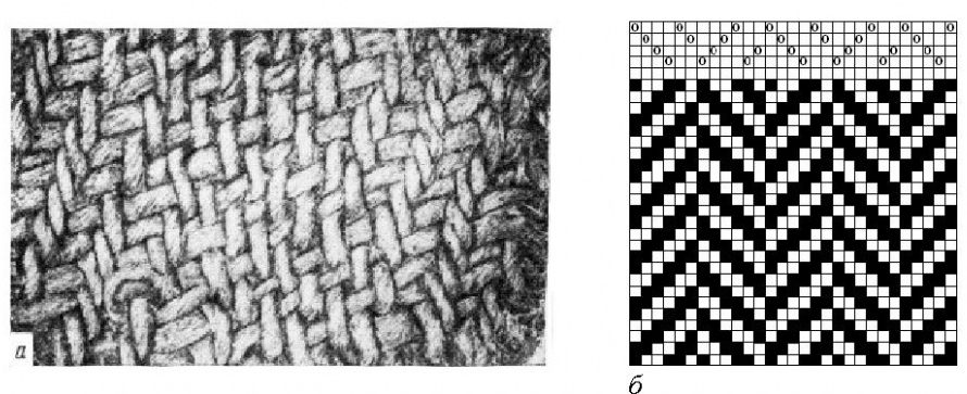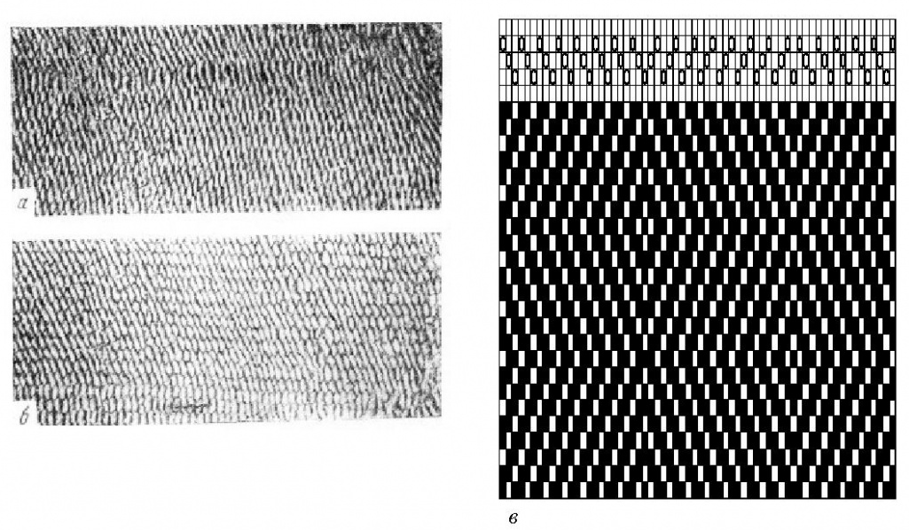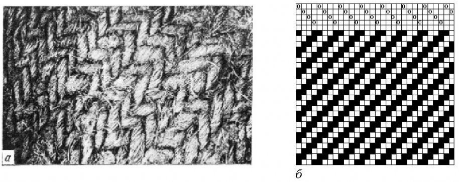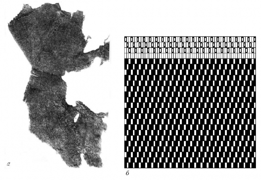 а — фрагмент ткани Н-58/2815, ярус 16; б — схема саржевого переплетения 2/2 «в елочку»
